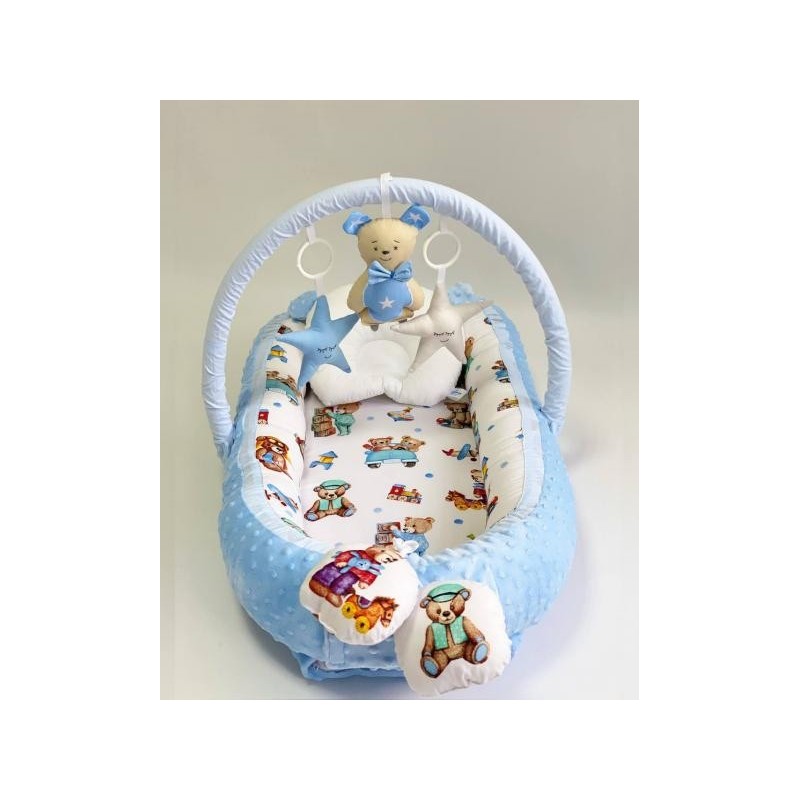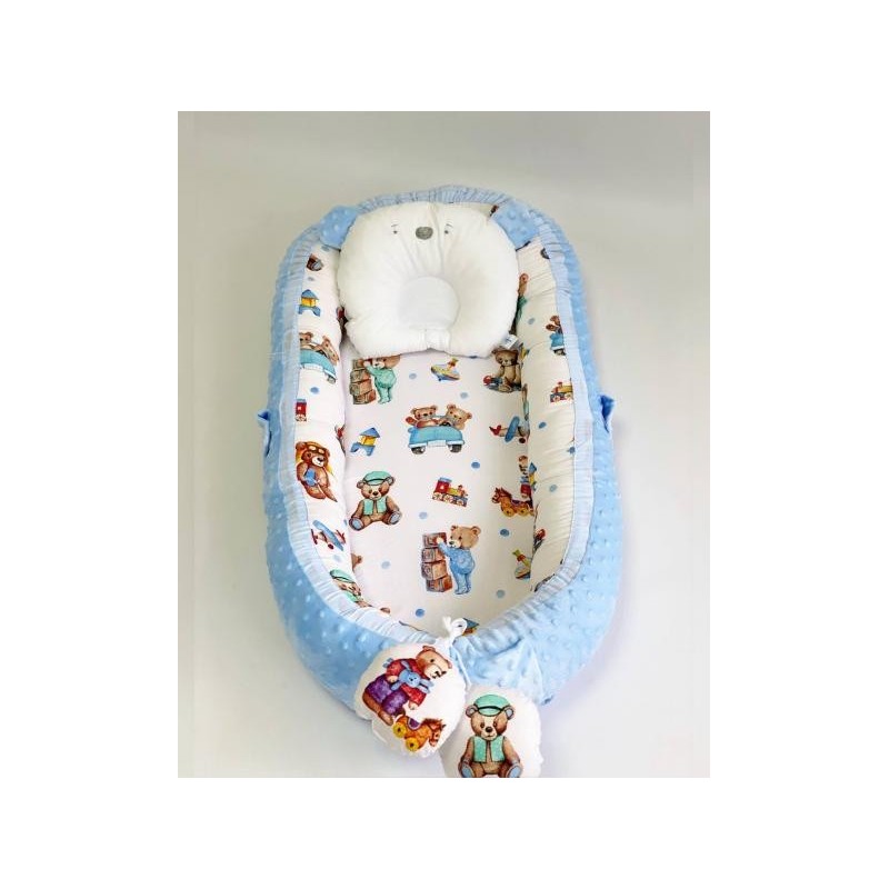 Pentru a ne adapta cerintelor mamicilor folosim doar materiale de calitate. Babynest-ul este umplut cu bumbac 100% natural care indeplineste toate standardele europene de si o tesatura din material moale si pufos Minky Dot.