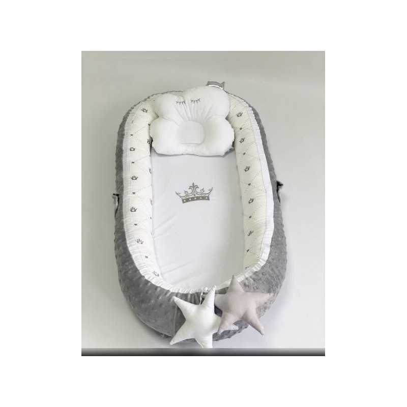 Pentru a ne adapta cerintelor mamicilor folosim doar materiale de calitate. Babynest-ul este umplut cu bumbac 100% natural care indeplineste toate standardele europene de si o tesatura din material moale si pufos Minky Dot.