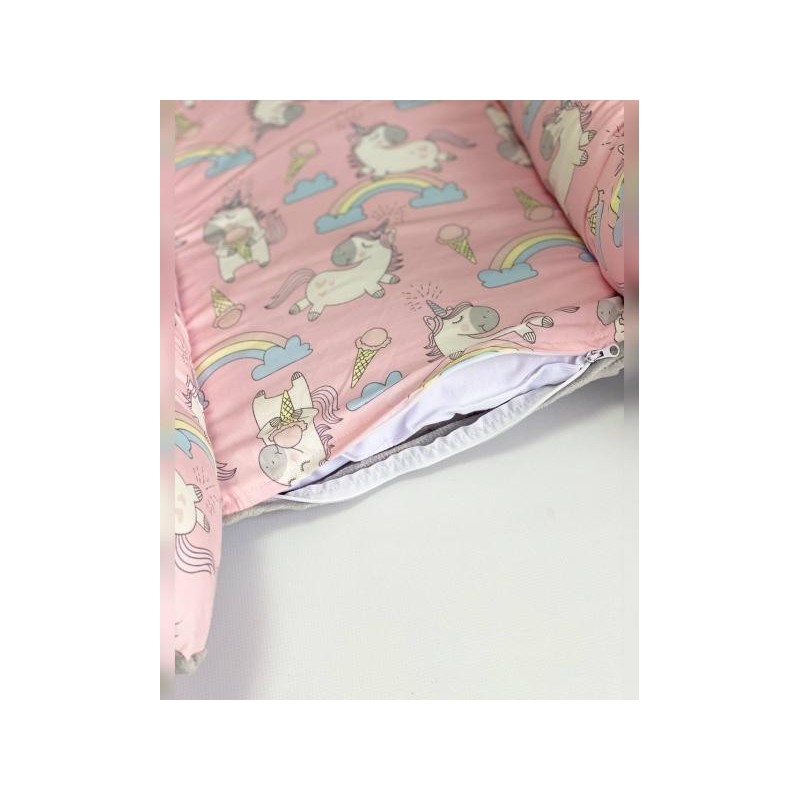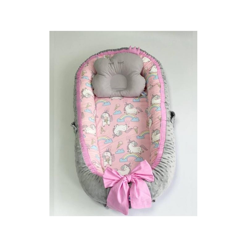 Pentru a ne adapta cerintelor mamicilor folosim doar materiale de calitate. Babynest-ul este umplut cu bumbac 100% natural care indeplineste toate standardele europene de si o tesatura din material moale si pufos Minky Dot.