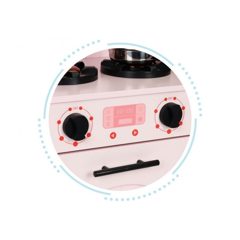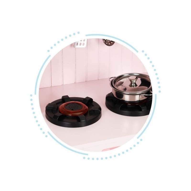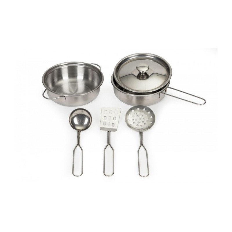 Structura este sigura si stabila, fara margini ascutite, ceea ce o face ideala pentru copii. Setul include 5 accesorii metalice de bucatarie, inclusiv o oala, o tigaie cu capac si 3 spatule.