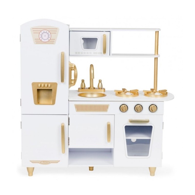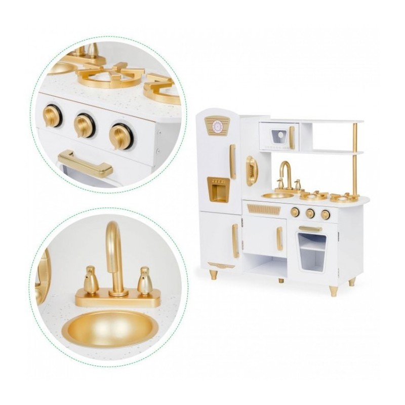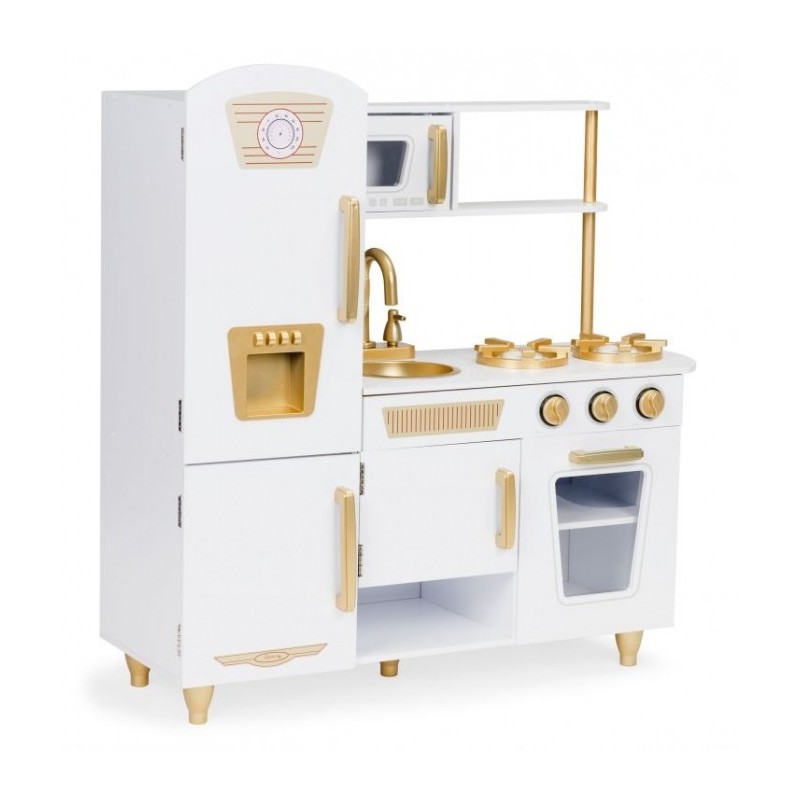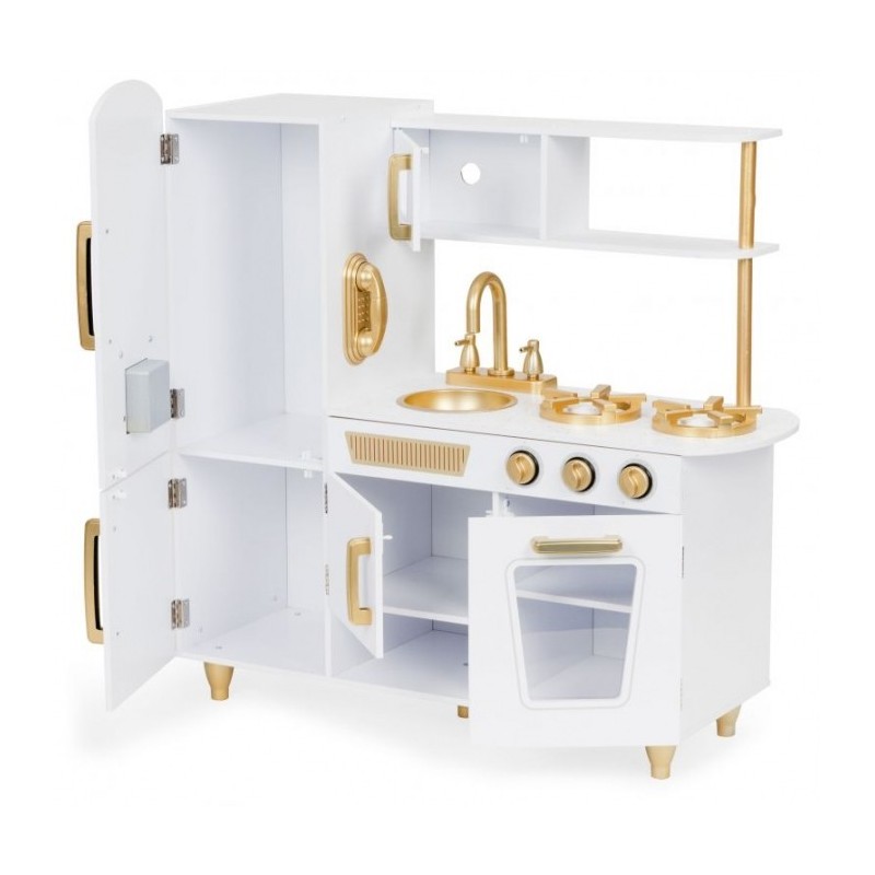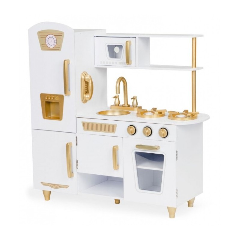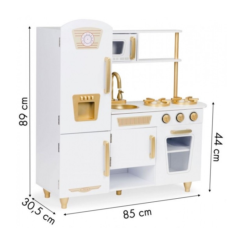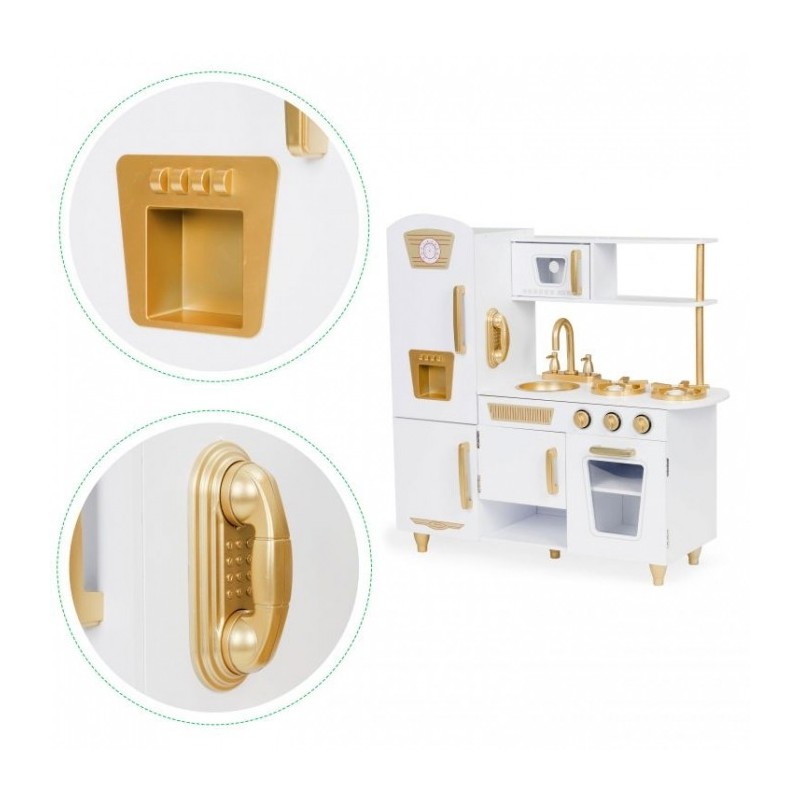 Bucataria este lipsita de elemente periculoase si margini ascutite, iar intregul set a fost acoperit cu vopsele sigure pentru copii. Datorita culorilor discrete si placute, jucaria se va potrivi perfect in camerele copiilor, salile de joaca si cu siguranta va atrage atentia tuturor copiilor. Dezvolta imaginatia, creativitatea si abilitatile manuale. Bucatarie din lemn cu dulapuri care se pot deschide, butoane mobile ale aragazului, telefon etc.