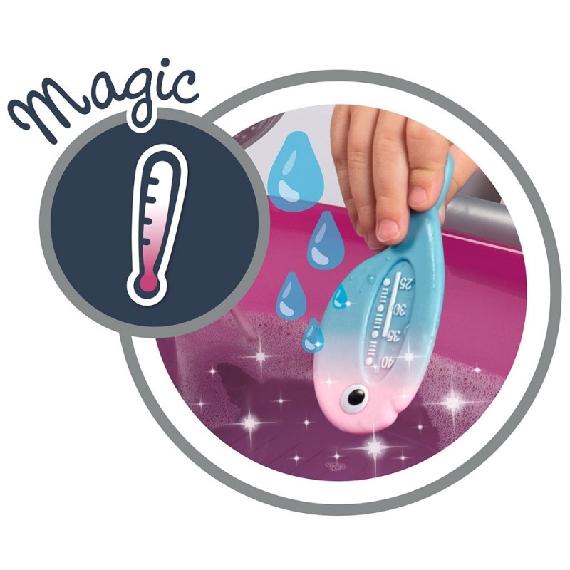 - Datorita accesoriilor pentru papusi, copilul se poate juca de-a mama si tata: pelerina de baie din material, dozator de spuma cu gel de dus, termometrul termosensibil in forma de balena (isi schimba culoarea)