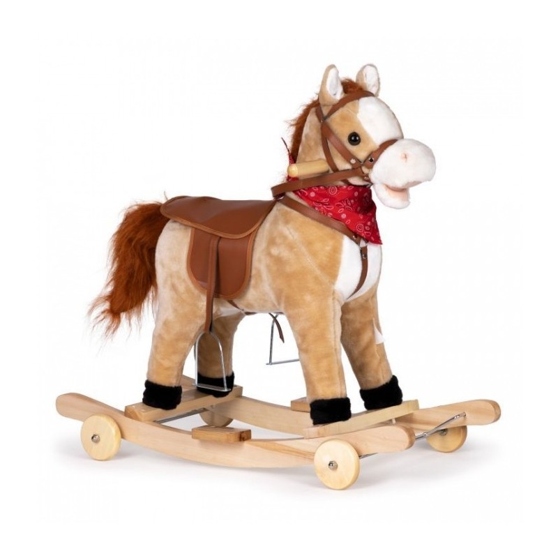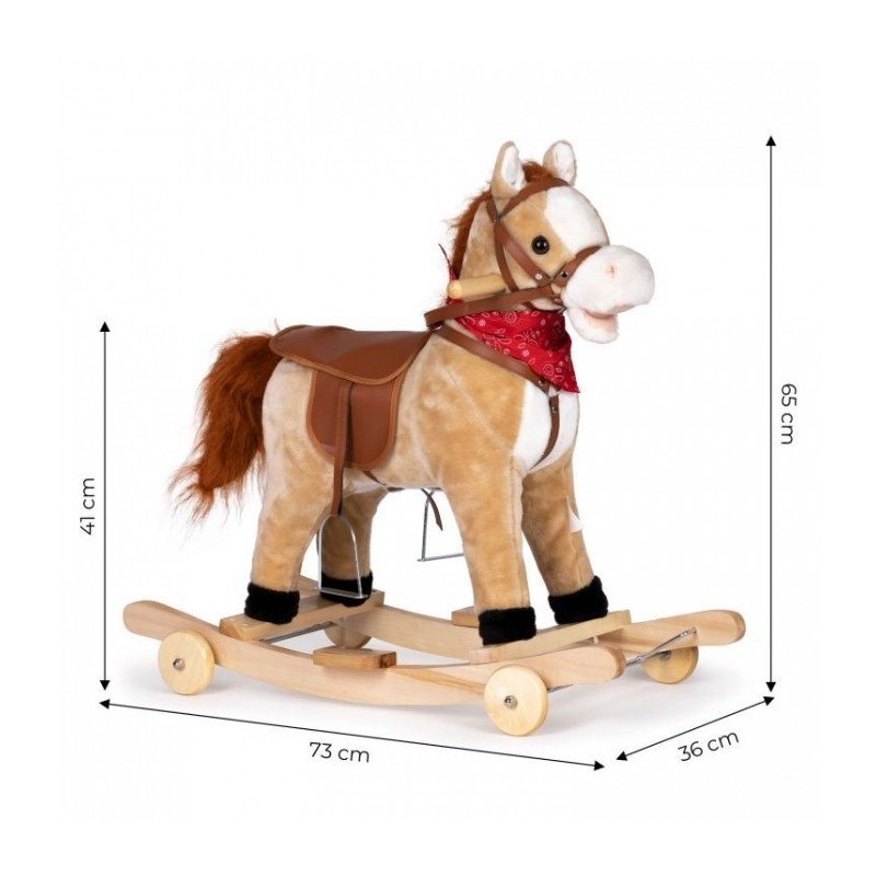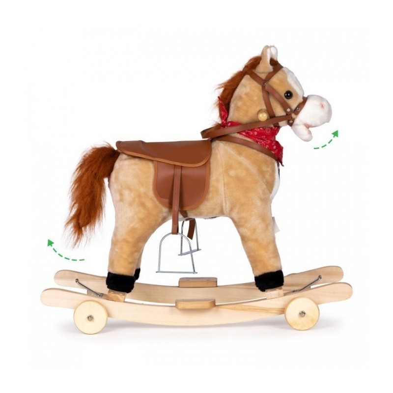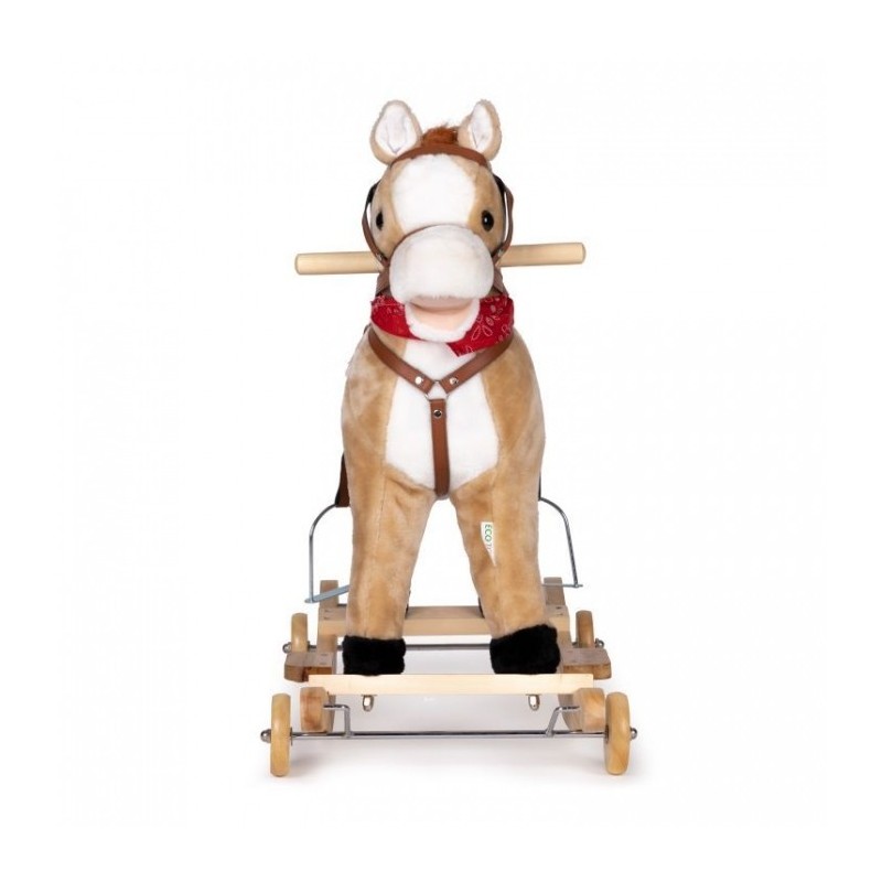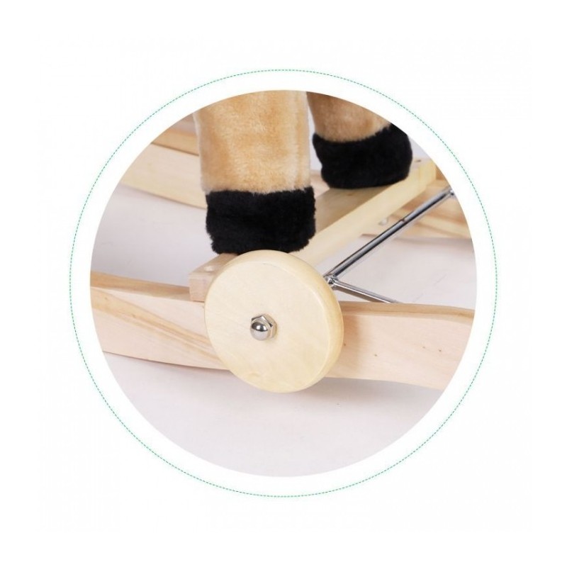 Patinele din lemn asigura stabilitatea in timpul jocului si balansarii, iar „picioarele” suplimentare asezate pe ele asigura siguranta la urcare si coborare. La capetele lor exista roti atasate de axa, ceea ce este suficient pentru a se inclina, datorita carora calul va sta pe patinele din lemn sau roti. Calutul isi misca coada si gura.