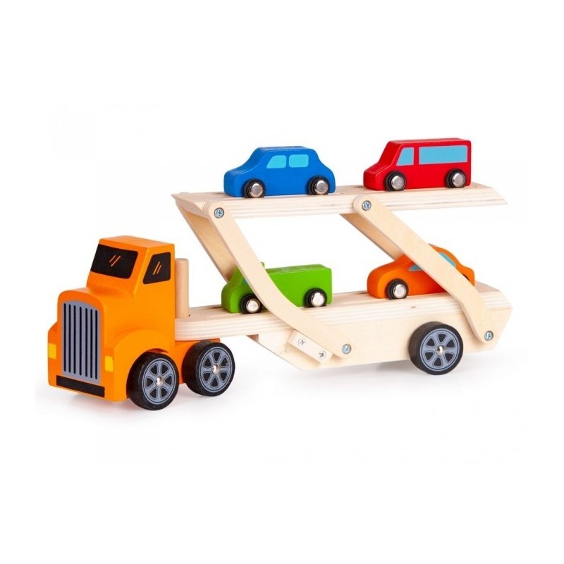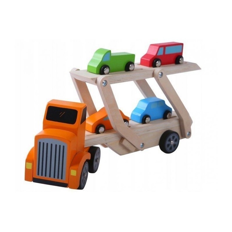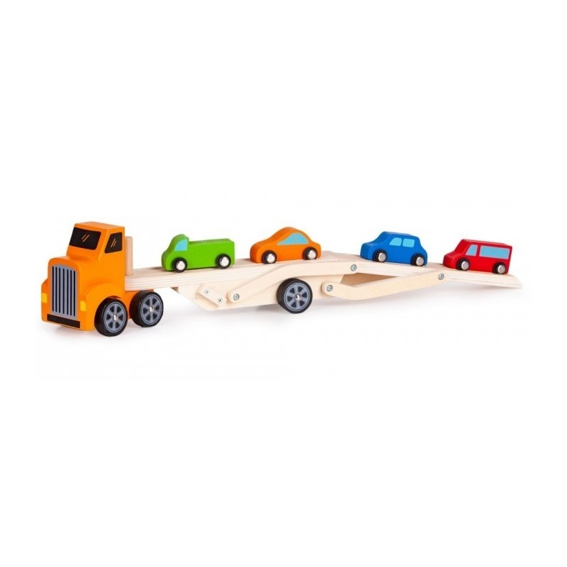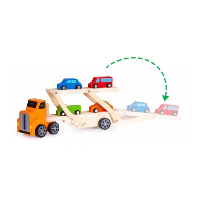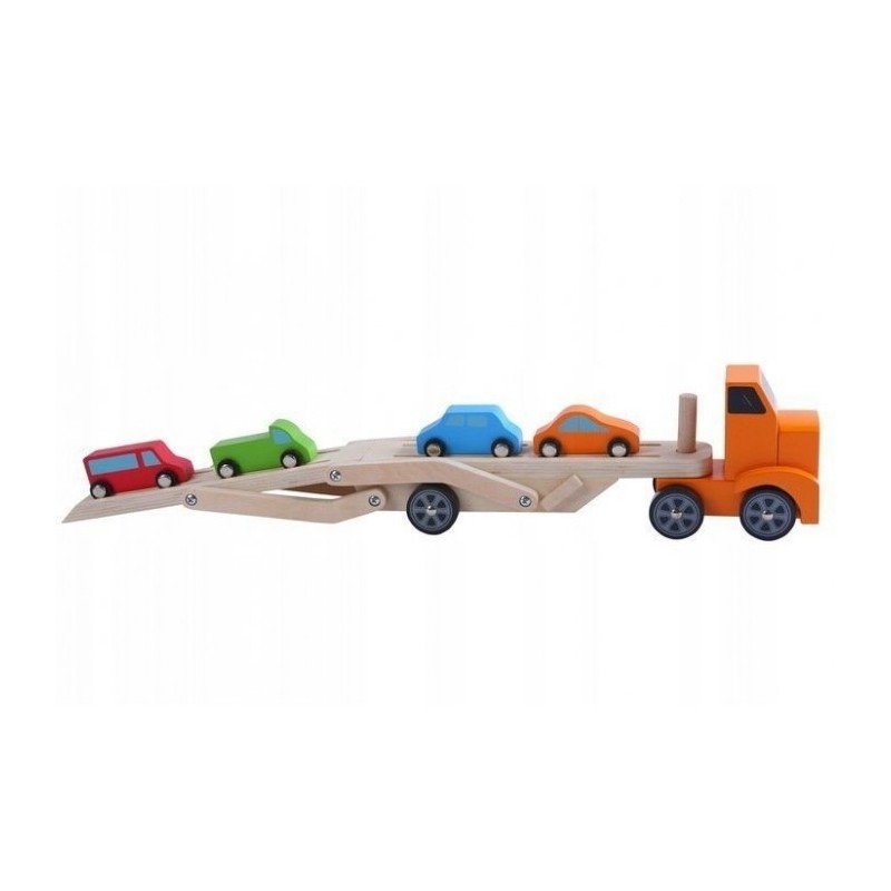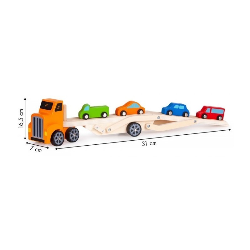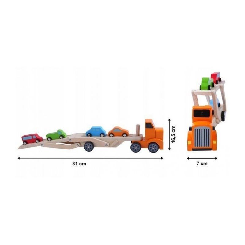 Remorca de tip Lora este formata dintr-un camion din lemn si o remorca detasabila, care este mobila si va permite sa incarcati masini mici. In plus, setul include 4 masini mici de diferite culori. Toate elementele sunt lipsite de margini ascutite si sunt vopsite cu o vopsea care este sigura pentru copii.