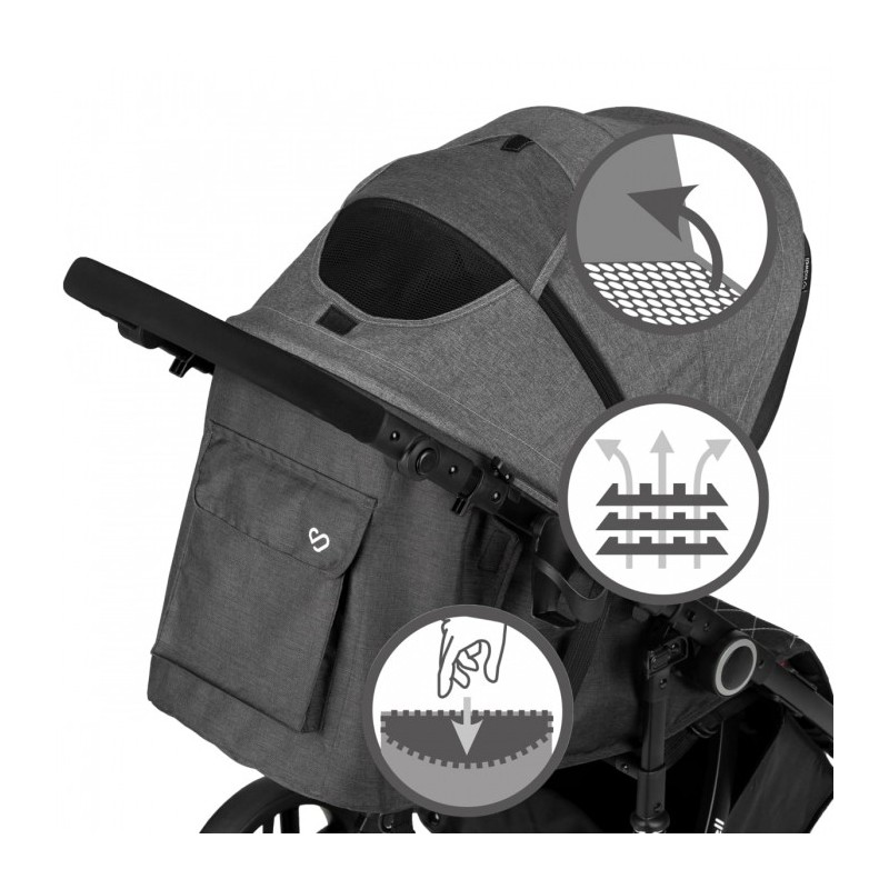 Vara - soare arzator si calatorii mai lungi - o copertina pliabila cu o clapa detasabila va proteja copilul de soarele excesiv, o fereastra care se deschide in copertina va permite o ventilatie adecvata, o structura spatioasa va permite un pui de somn confortabil si regenerant. Suportul de bauturi reci va permite parintelui sa se improspateze.