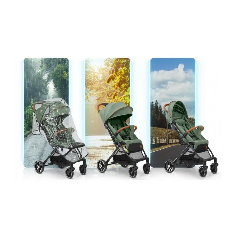• Rotile mari faciliteaza navigarea pe teren denivelat, iar o husa de ploaie va protejeaza copilul de umiditate;