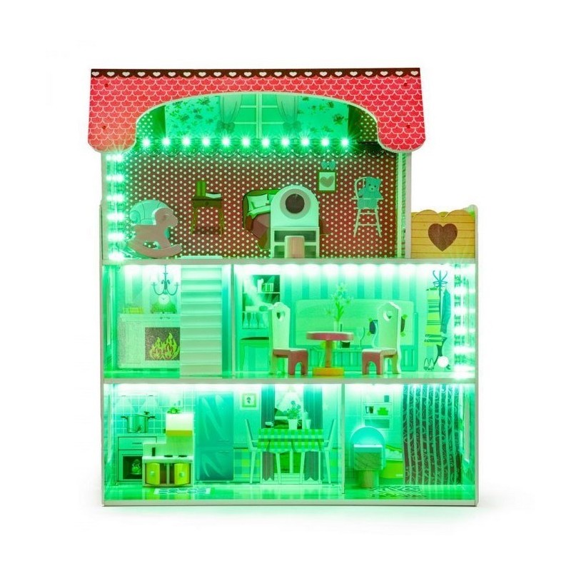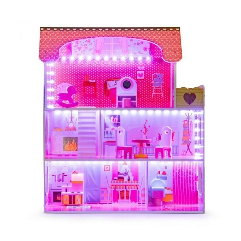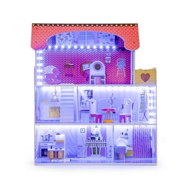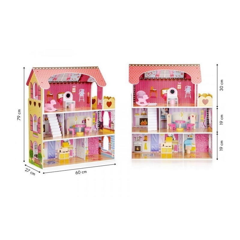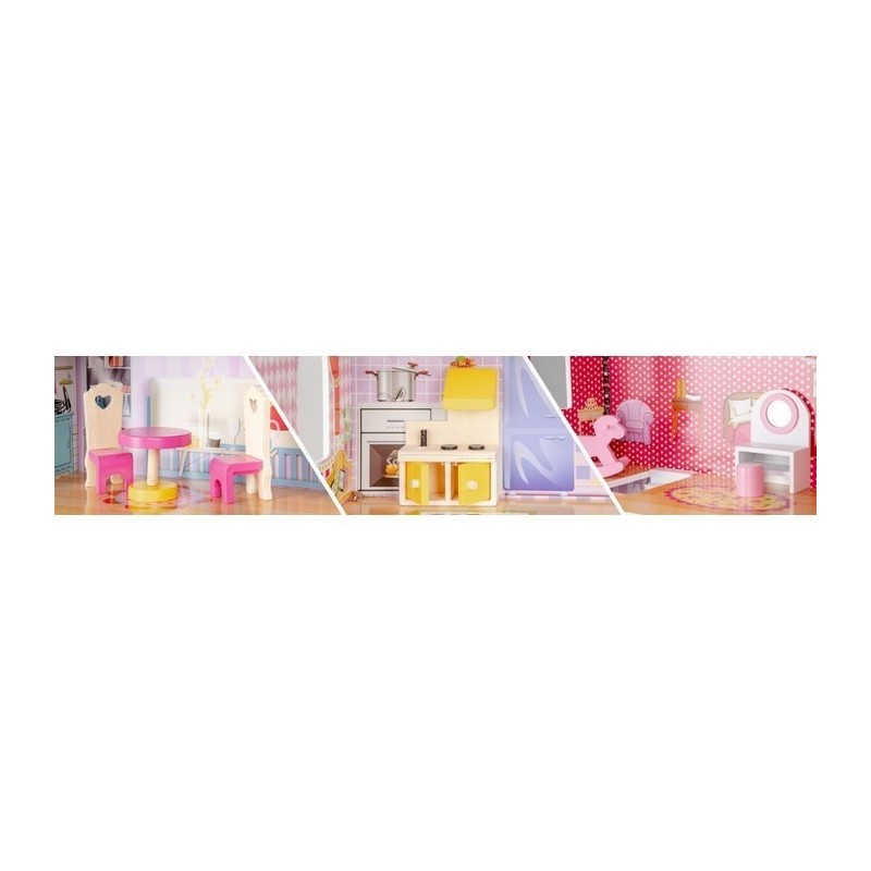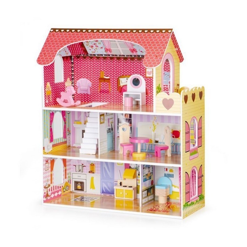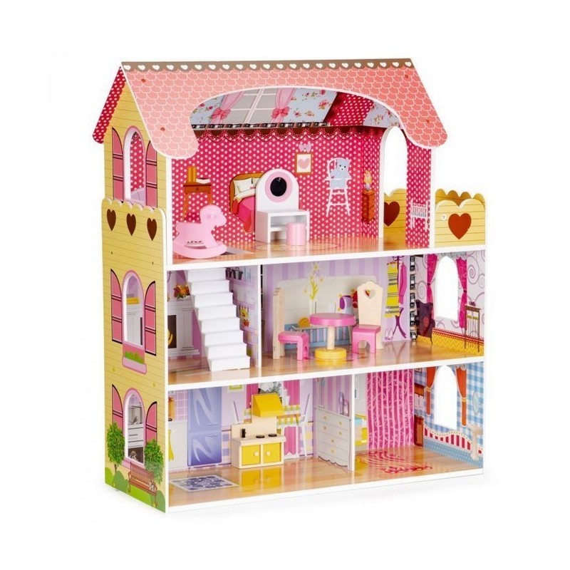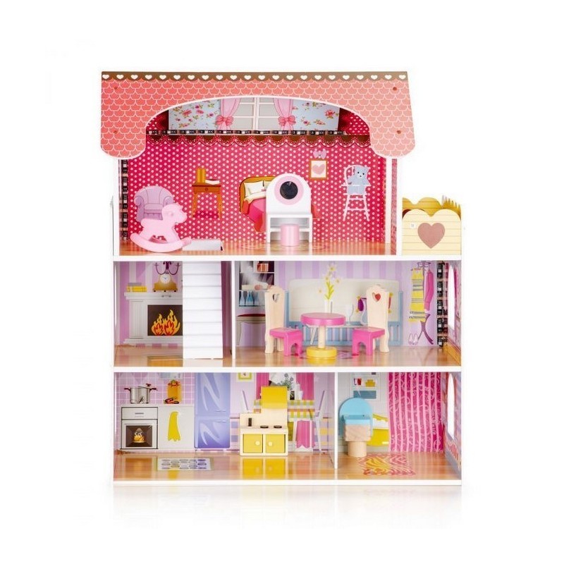 Intreaga casa este realizata din lemn de inalta calitate, ceea ce face ca jucaria sa serveasca multi ani. La primul nivel exista o bucatarie cu dulapuri, chiuveta si toaleta. Etajul al doilea este o camera de zi cu masa si scaune si o camera mai mica, cu scari care duc la mansarda. La ultimul etaj veti gasi un dormitor mare cu acces la terasa.