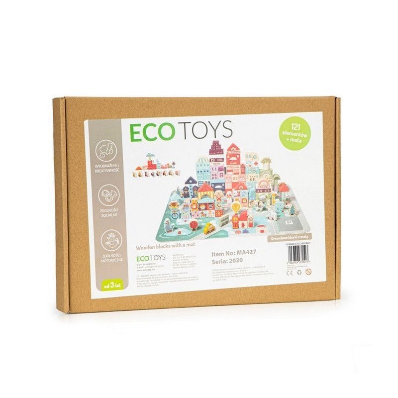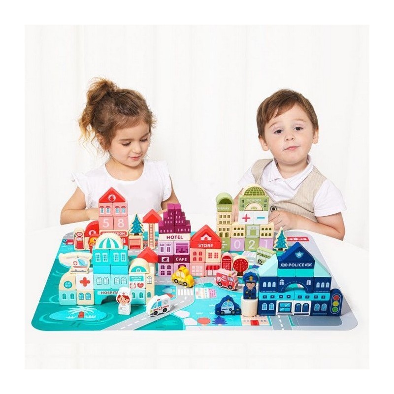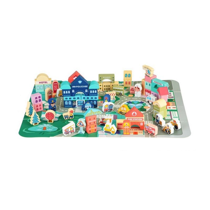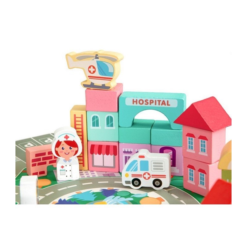 Un set de blocuri de lemn va permite sa construiti un oras mare, care include cladiri precum: un hotel, spital, magazin, sectie de politie, scoala si chiar o statie de pompieri. Fiecare cladire a fost proiectata folosind multe detalii, ceea ce permite recunoasterea functiei sale. In plus, cladirile au propriile lor masini, potrivite in mod ideal rolului pe care il indeplinesc. Intregul set este completat de un covor cu strazi pe care ne putem construi orasul.