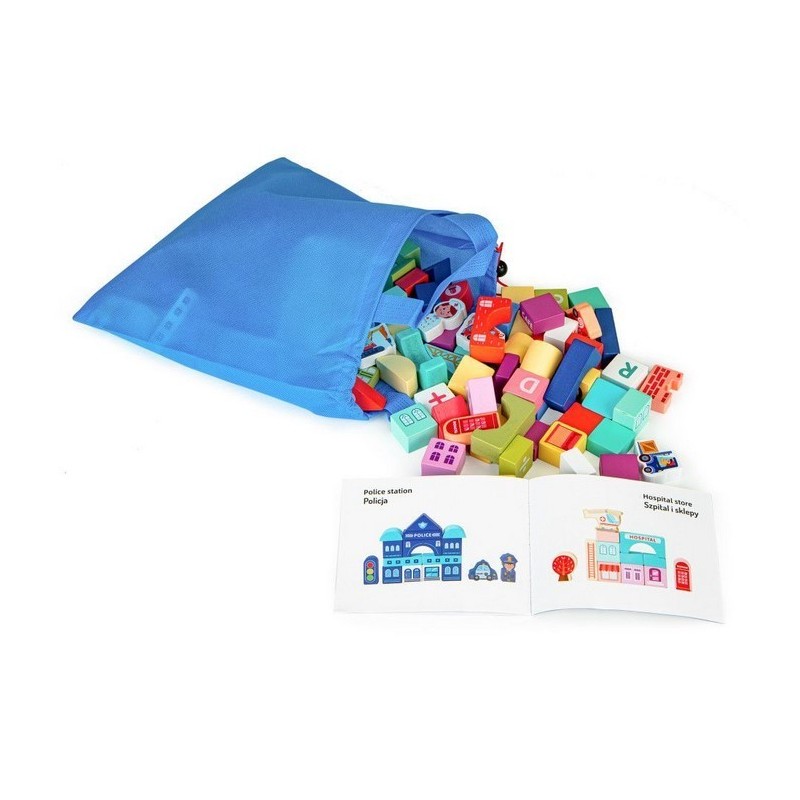 Brosura inclusa in set va ajuta la construirea si recunoasterea fiecarei cladiri. Setul cu blocuri include o geanta spatioasa, datorita careia copilul dvs. poate lua blocurile intr-o calatorie de familie sau intalnire cu prietenii.