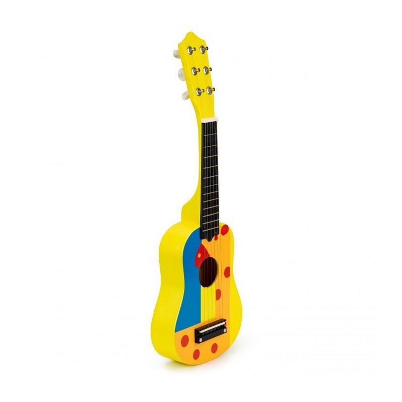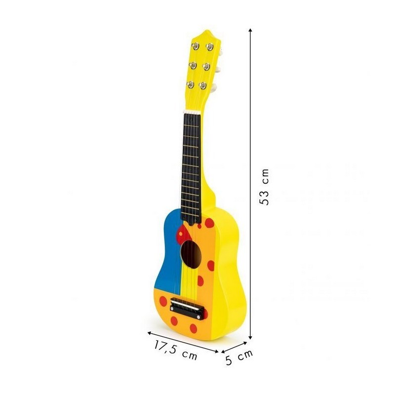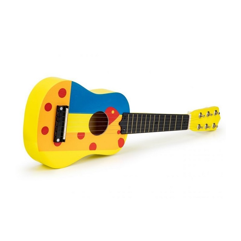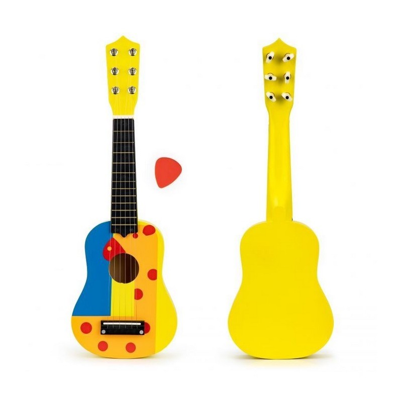 Copiii adora muzica de la o varsta frageda, sunt interesati de sunete, canta, danseaza si incearca sa cante la instrumente simple. Daca copilul tau priveste muzicienii, cantand in acelasi timp cu entuziasm si admiratie, se preface ca a inventat tobe sau chitara, inseamna ca adevaratul talent muzical se poate maturiza acasa. Merita sa sustii astfel de interese si sa le dezvolti de la inceput alegand jucariile potrivite. O chitara Ecotoys se poate dovedi primul pas catre o mare pasiune. Chitara a fost conceputa pentru a avea toate caracteristicile unei chitare de dimensiuni mari. Are 6 corzi si 12 „taste” pe gat, cu posibilitatea de acordare.