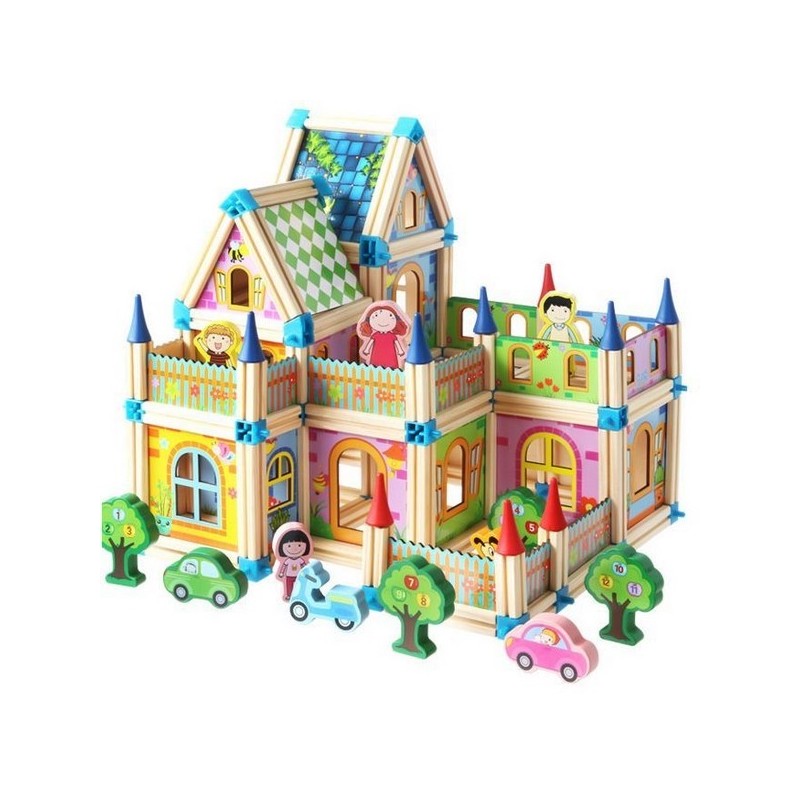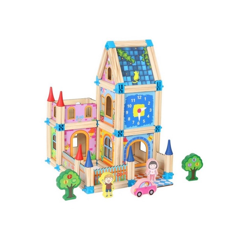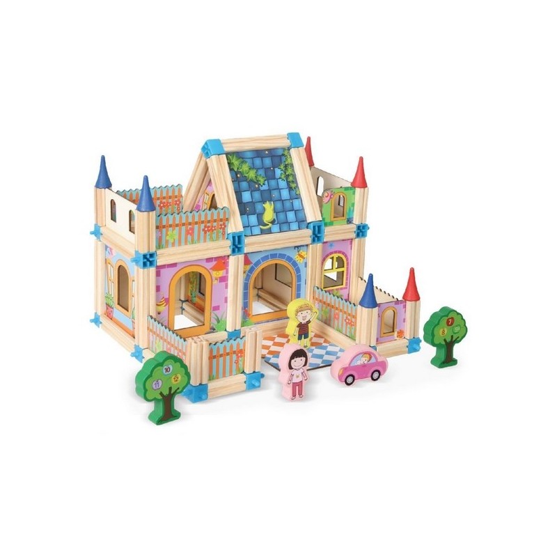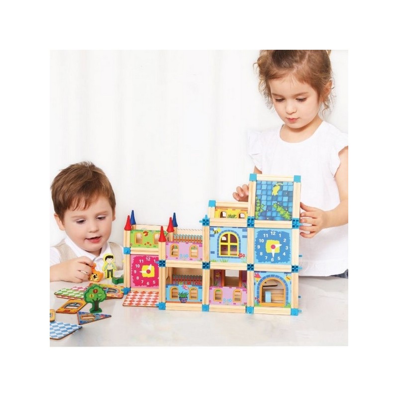 Setul include pana la 128 de elemente diferite, printre care regasim blocuri de lemn, pereti desenati cu motive colorate imitand realitatea, figurine, omuleti, vehicul, elemente de fixare din plastic.