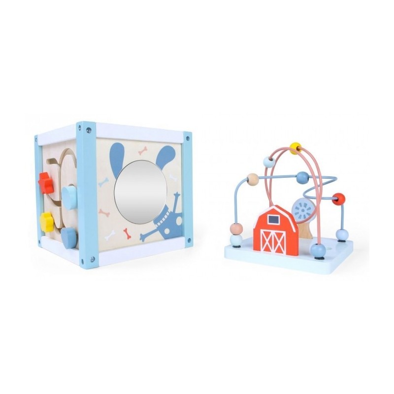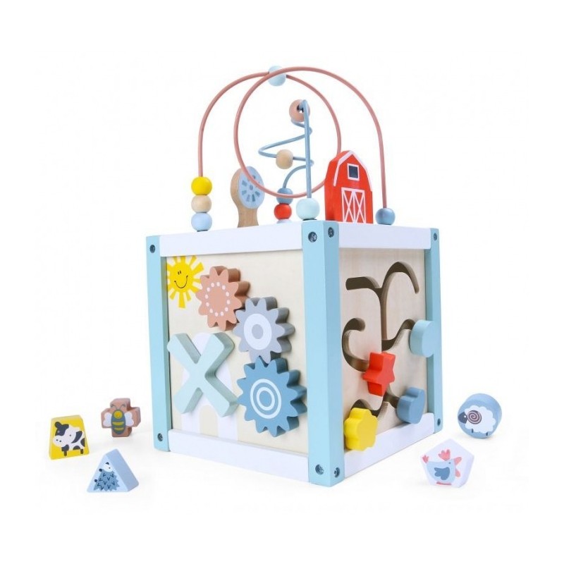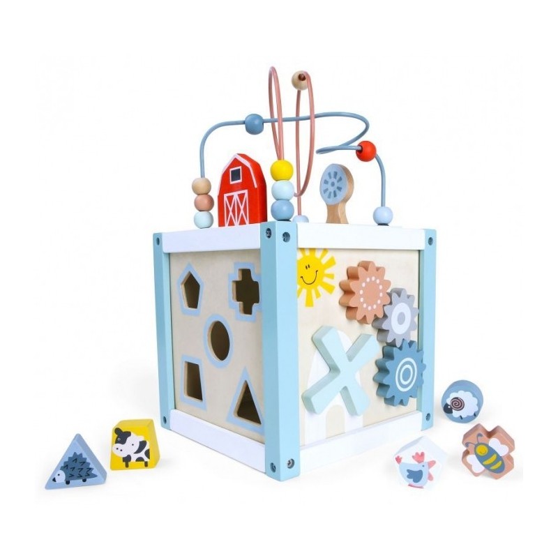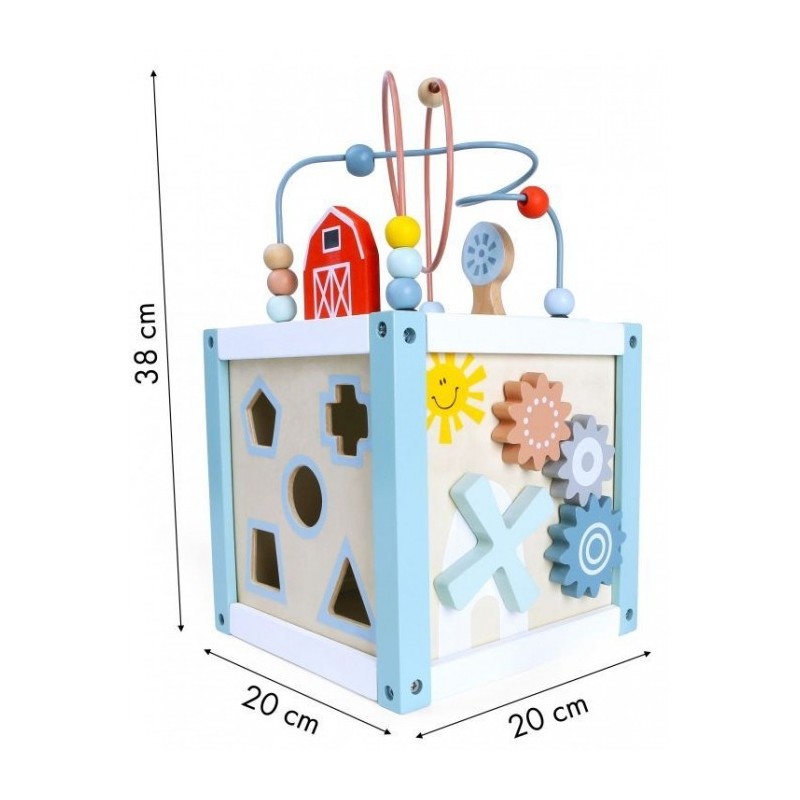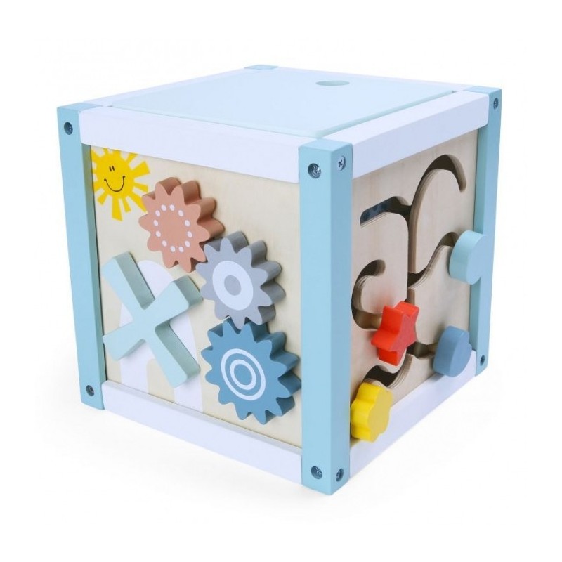 In partea superioara a jucariei exista o latura detasabila cu labirint si margele colorate. Pe partile laterale ale cubului, copilul se poate juca cu sortatorul prin potrivirea formei adecvate a blocurilor. Ceilalti pereti ai cubului au o oglinda, labirint si roti dintate rotative.