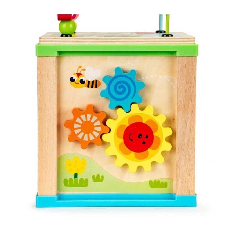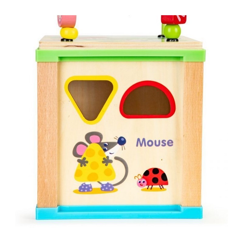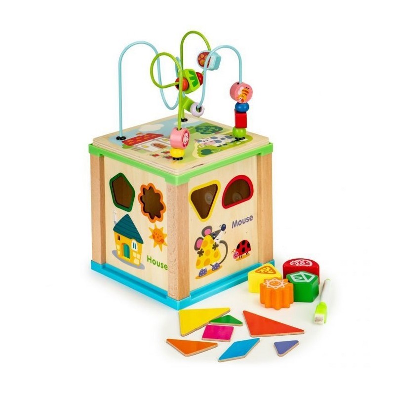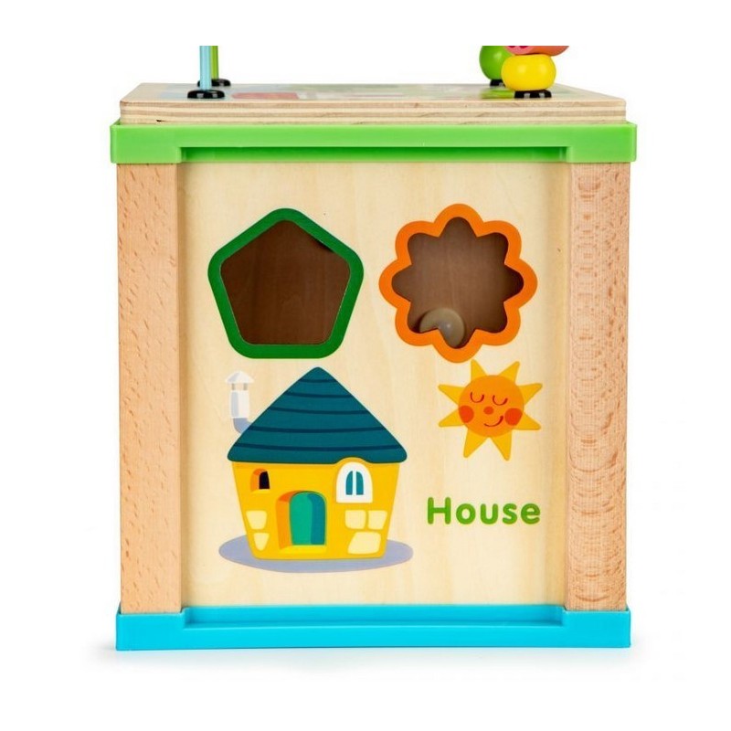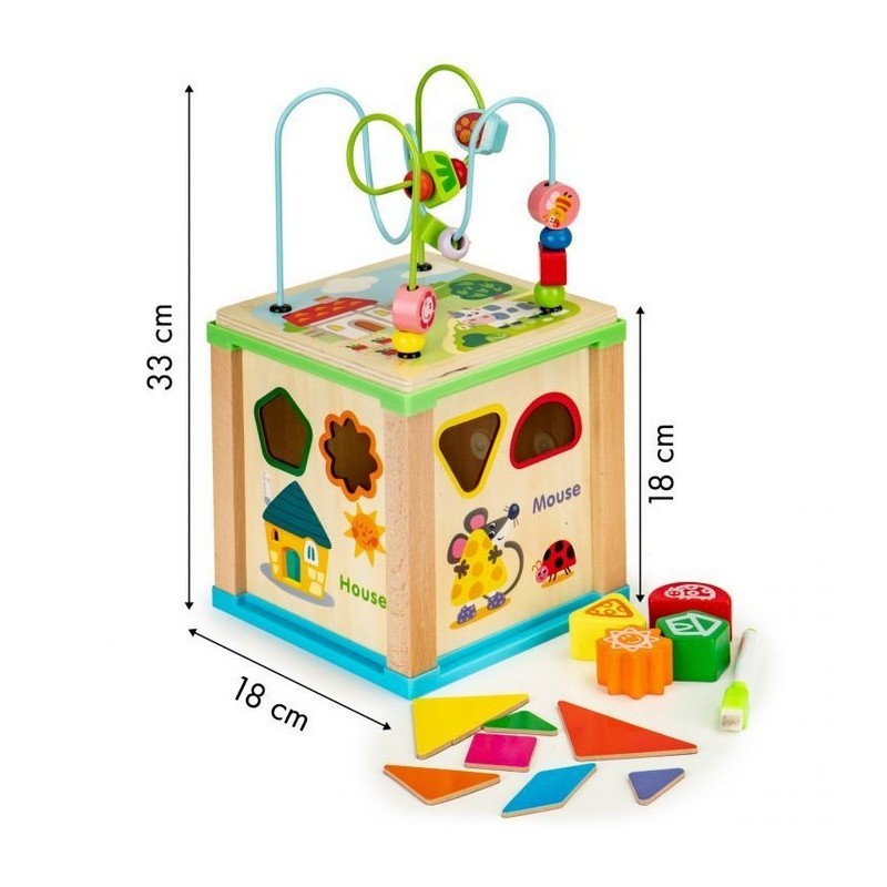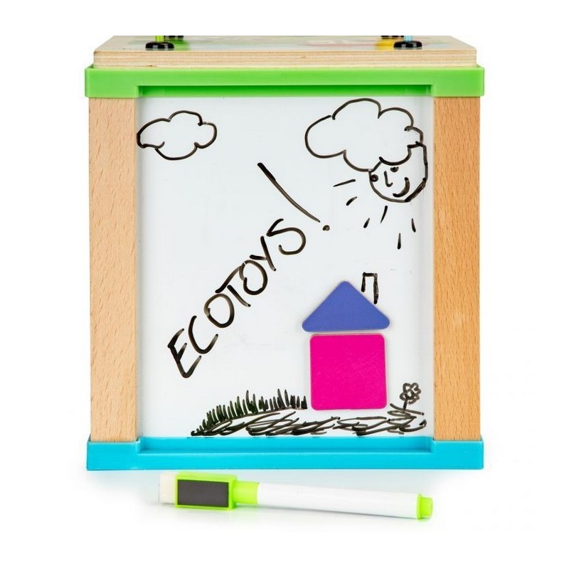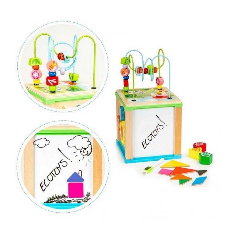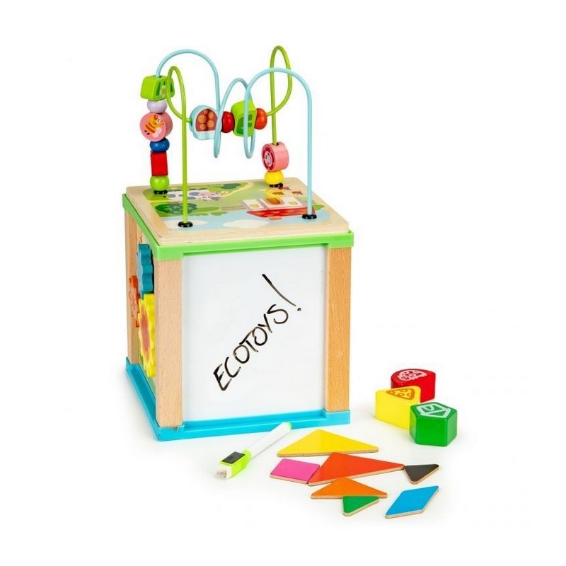 Cubul educational Ecotoys este realizat din lemn si stimuleaza dezvoltarea termenilor de recunoastere a formei, abilitatilor manuale si coordonarii mana-ochi.