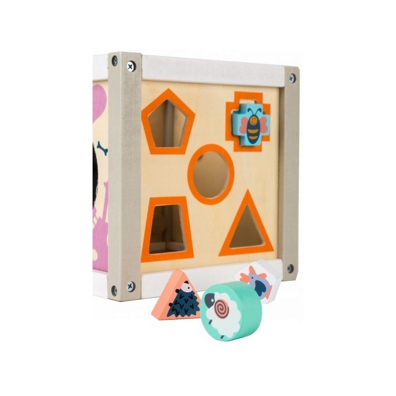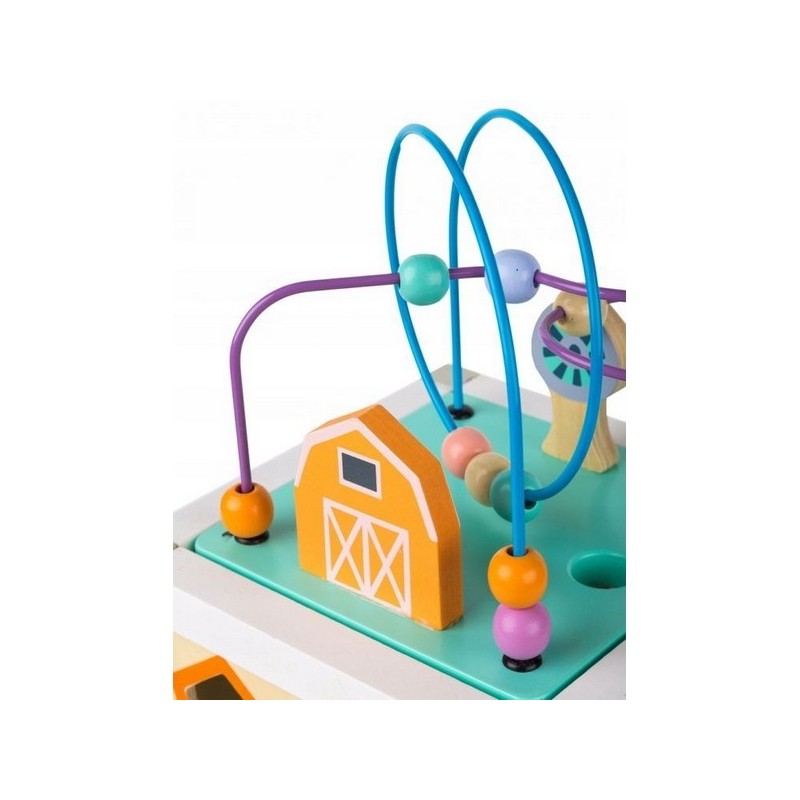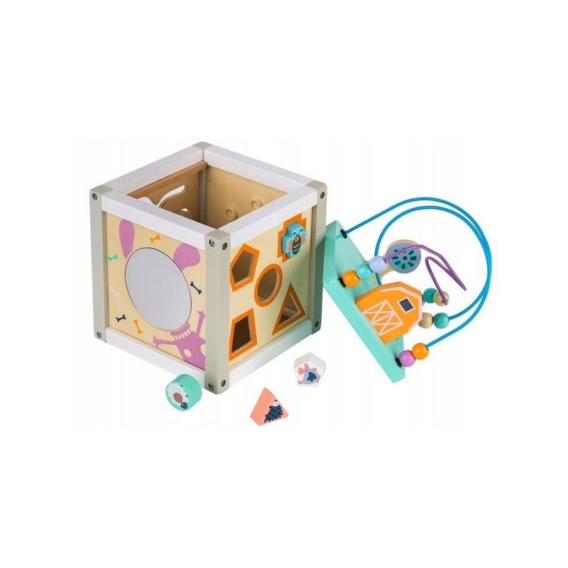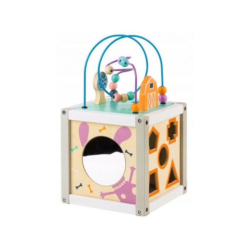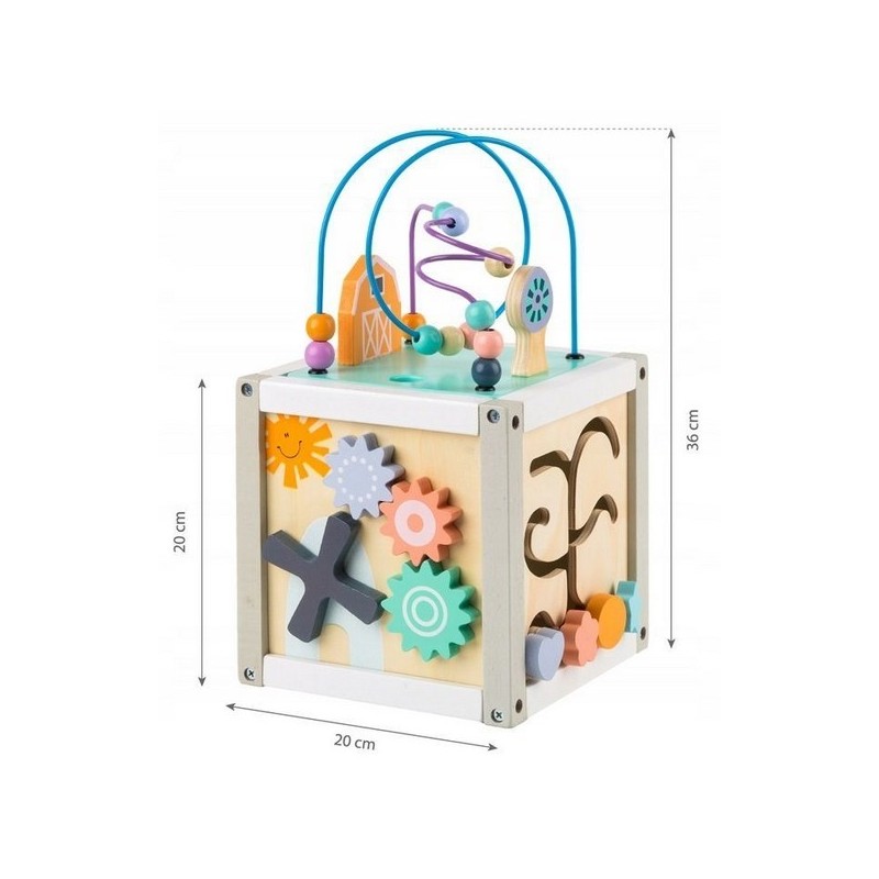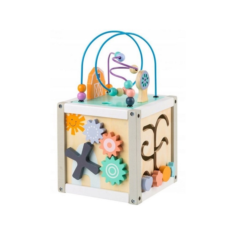 Fiecare perete avand o functionalitate diferita, cubul are numeroase elemente mobile si butoane care dezvolta abilitatile manuale ale copilului.