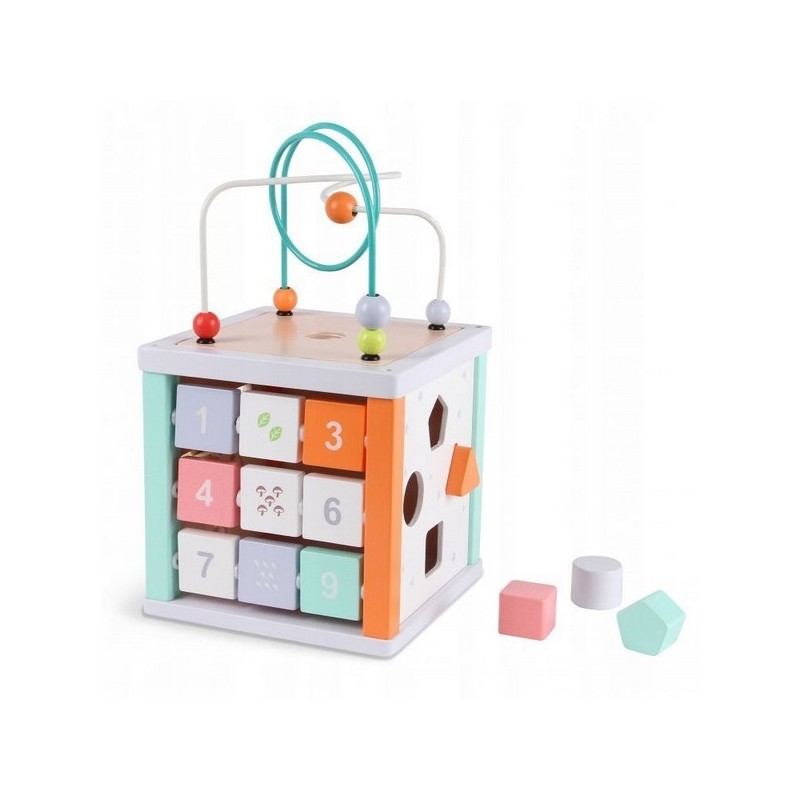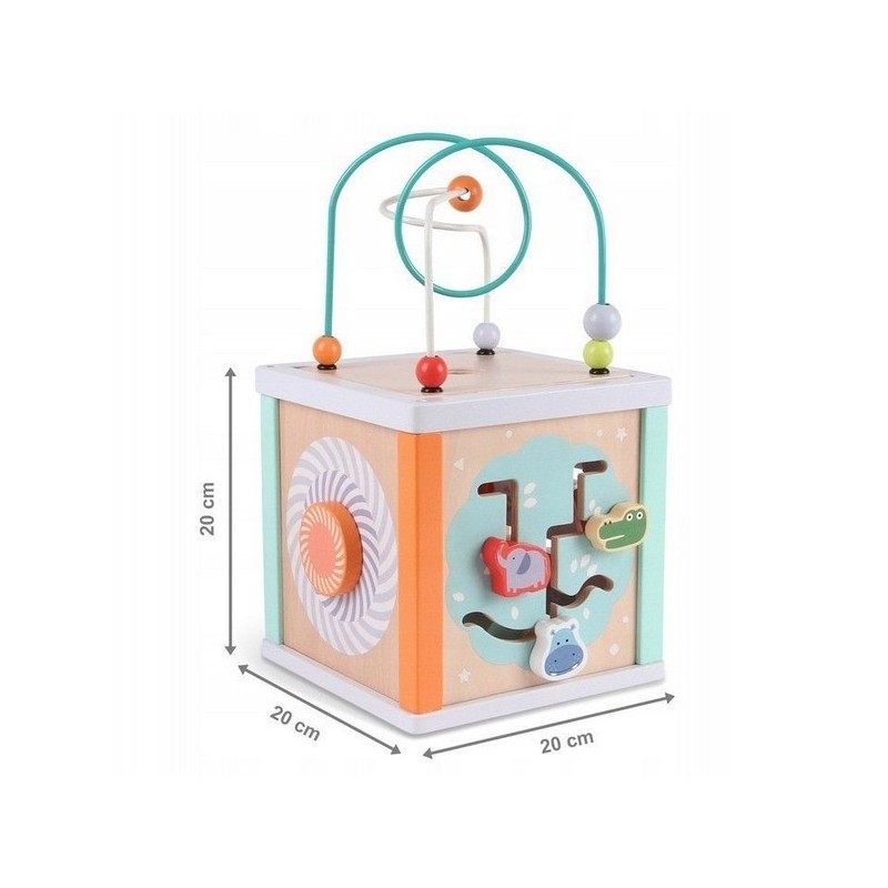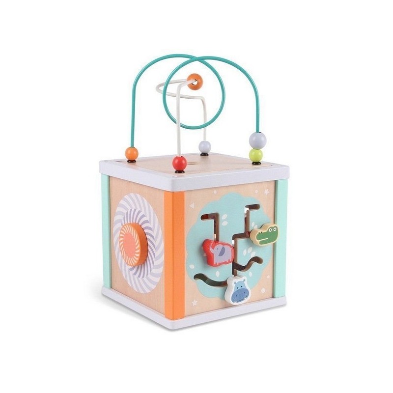 Fiecare perete având o funcționalitate diferită, cubul are numeroase elemente mobile și butoane care dezvoltă abilitățile manuale ale copilului.