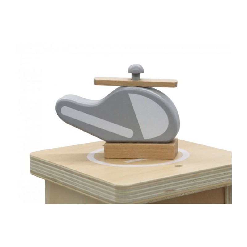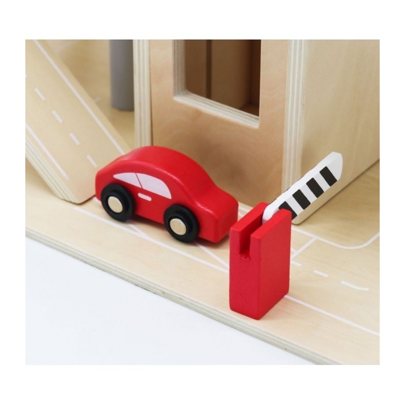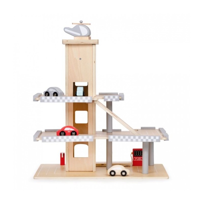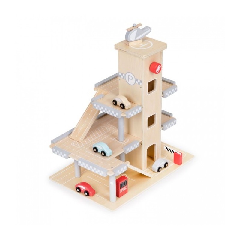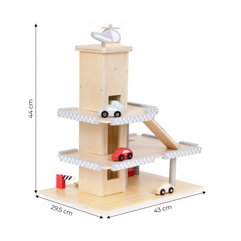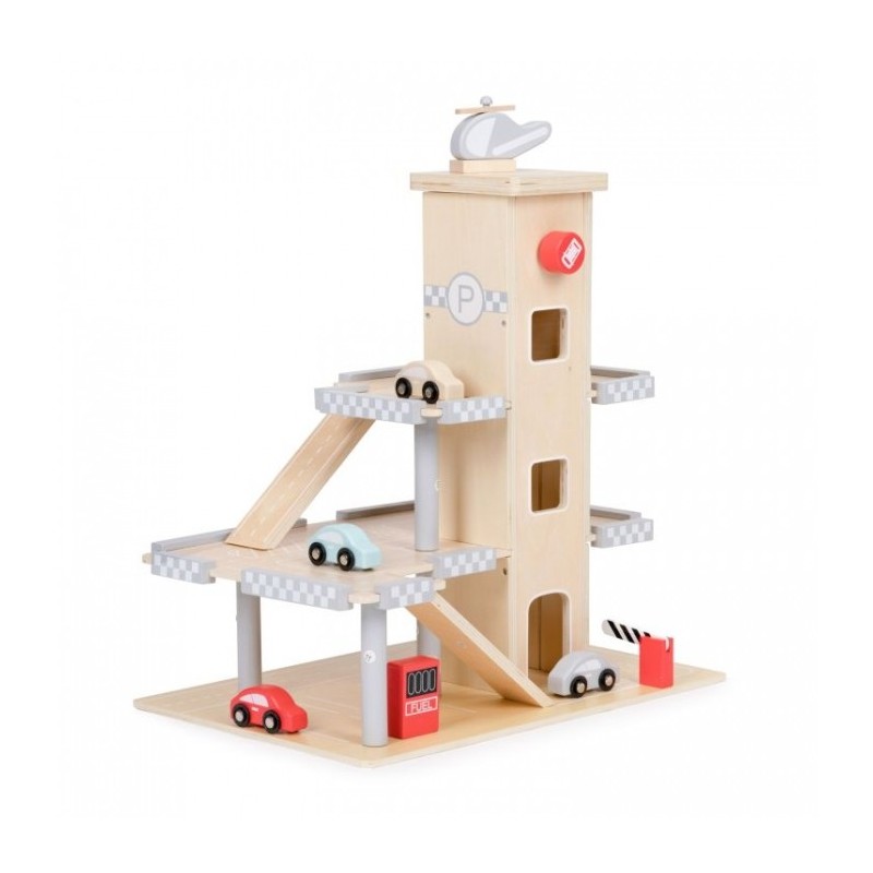 Garajul din lemn, pe 3 nivele, a fost echipat cu un lift mobil. Se va potrivi masinilor incluse in set, pe care copilul le poate transporta in partea de sus a parcarii folosind butonul rosu. In garaj puteti gasi si o benzinarie, o bariera mobila si o rampa de aterizare pentru elicopter. Setul include 4 masinute si un elicopter. Jucaria este sigura pentru copii.