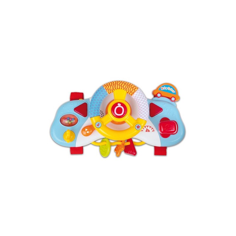 - Jucaria bebelusul sofer are atasat un volan si diverse clape care prin apasare declanseaza sunete si cantecele.