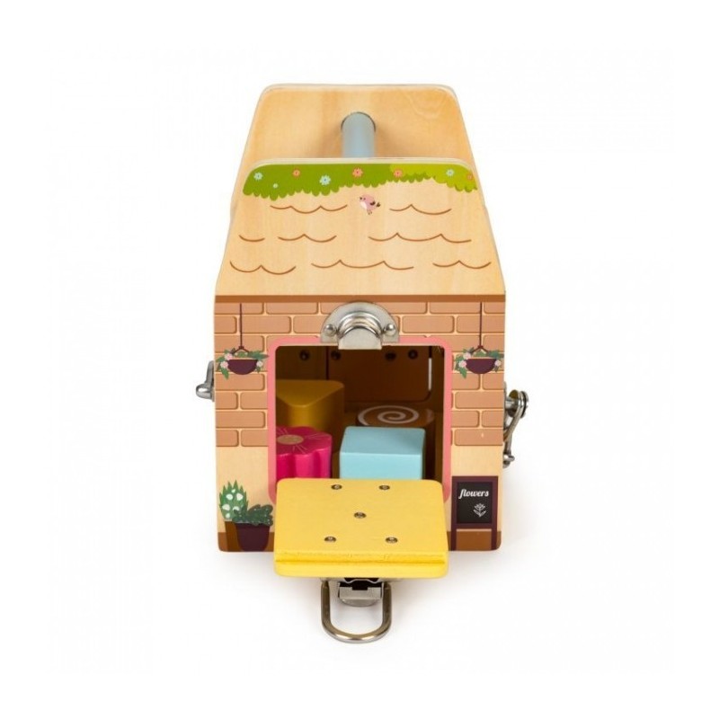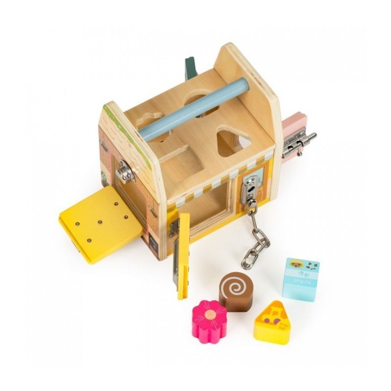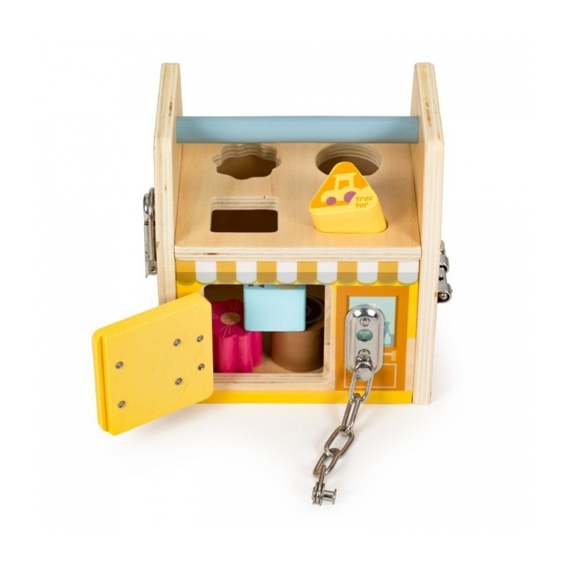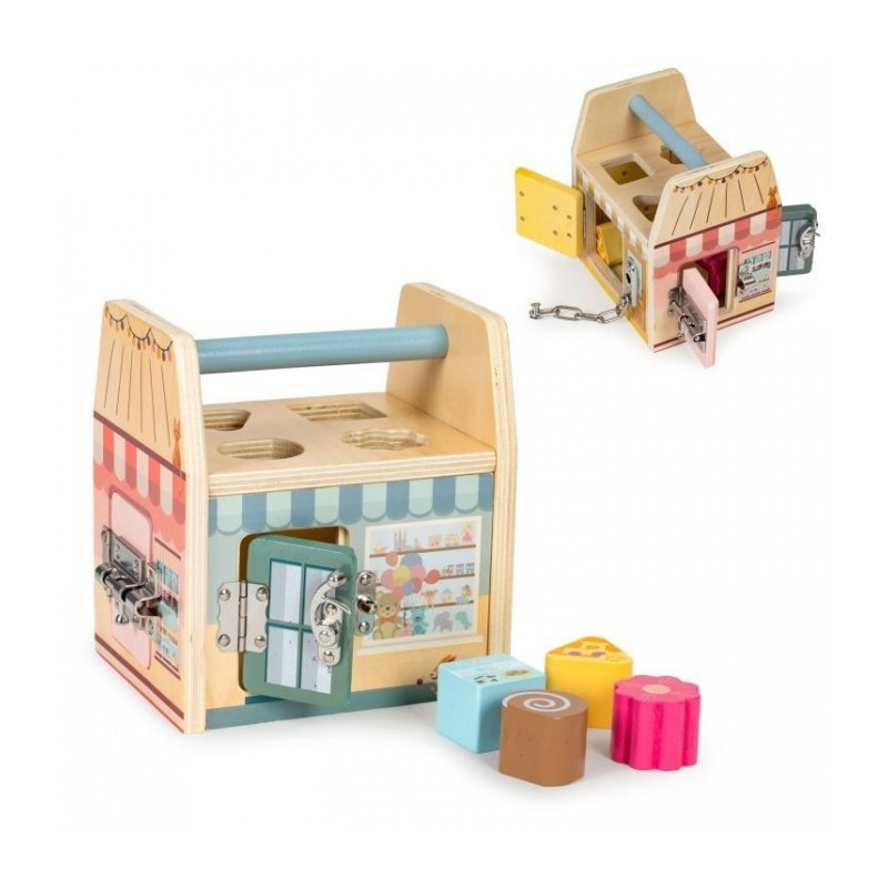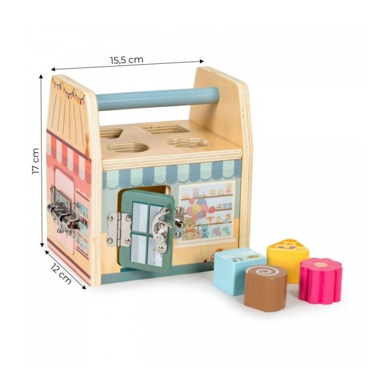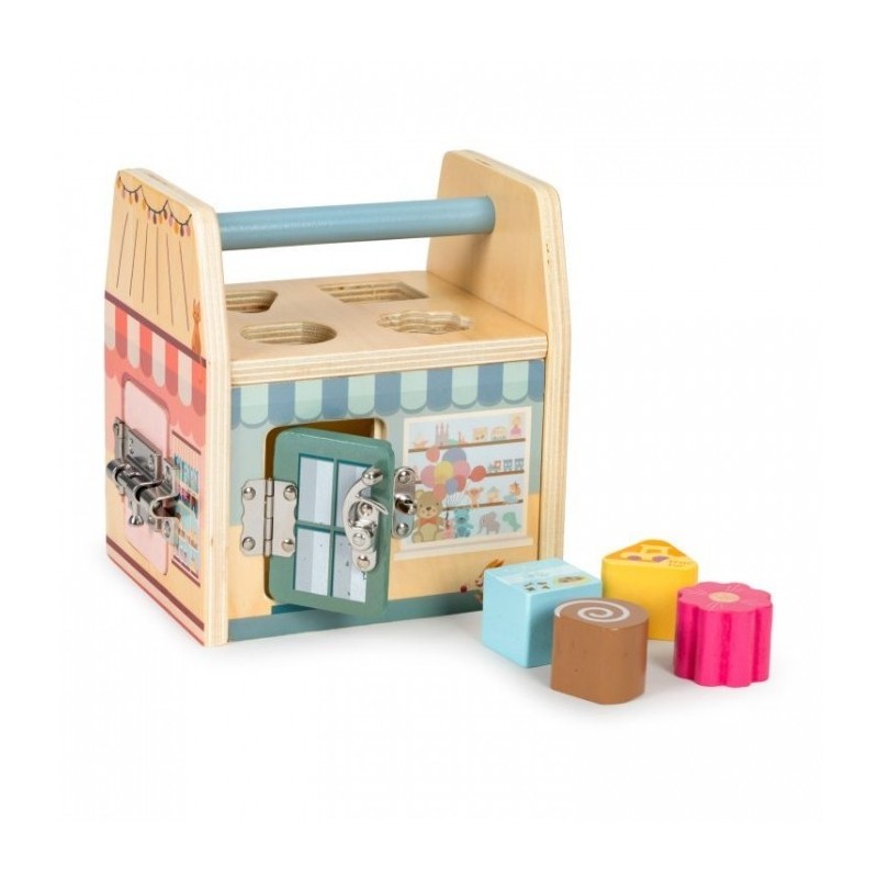 Este o jucarie educativa care dezvolta abilitatile manuale ale copilului. Are o structura solida si sigura din lemn. Peretii jucariei sunt prevazuti cu diverse activitati, iar manerul permite transportul usor. Datorita varietatii de activitati, copiii isi pot dezvolta abilitatile cognitive si motorii. In partea de sus a cubului exista un sortator de blocuri care il va invata pe copil sa recunoasca culorile si formele.