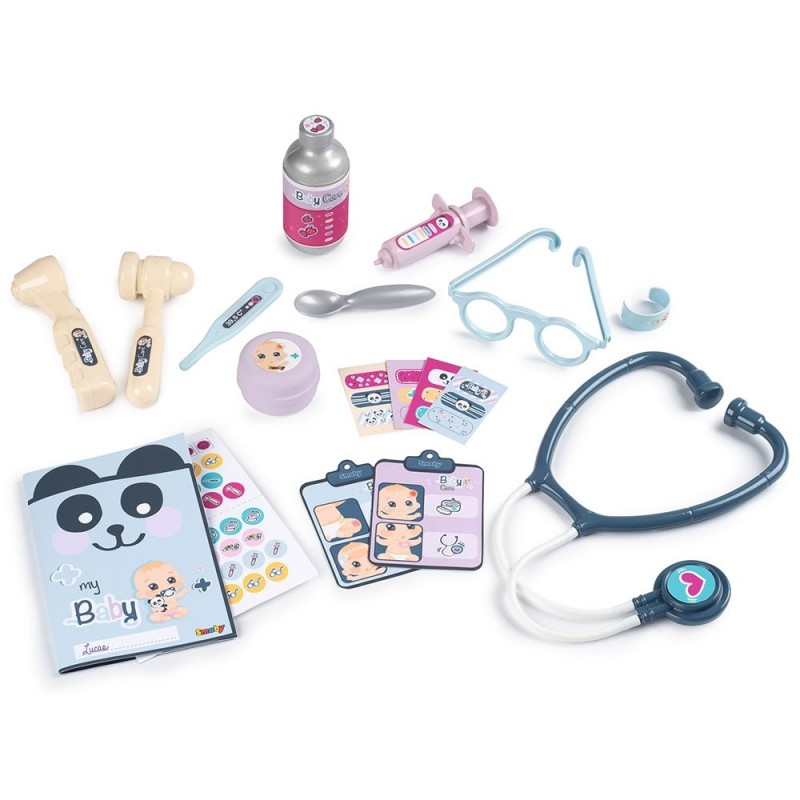 - O multime de accesorii sunt incluse pentru a-si indeplini cu succes misiunea: eticheta autoadeziva, ochelari de doctor, fisa pacient, stetoscop, termometru, otoscop, ciocan reflex, sirop, lingura si seringa cu actiune mecanica