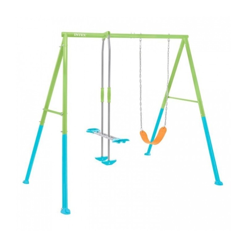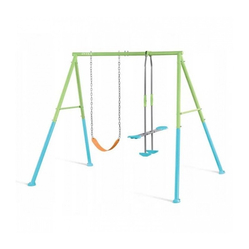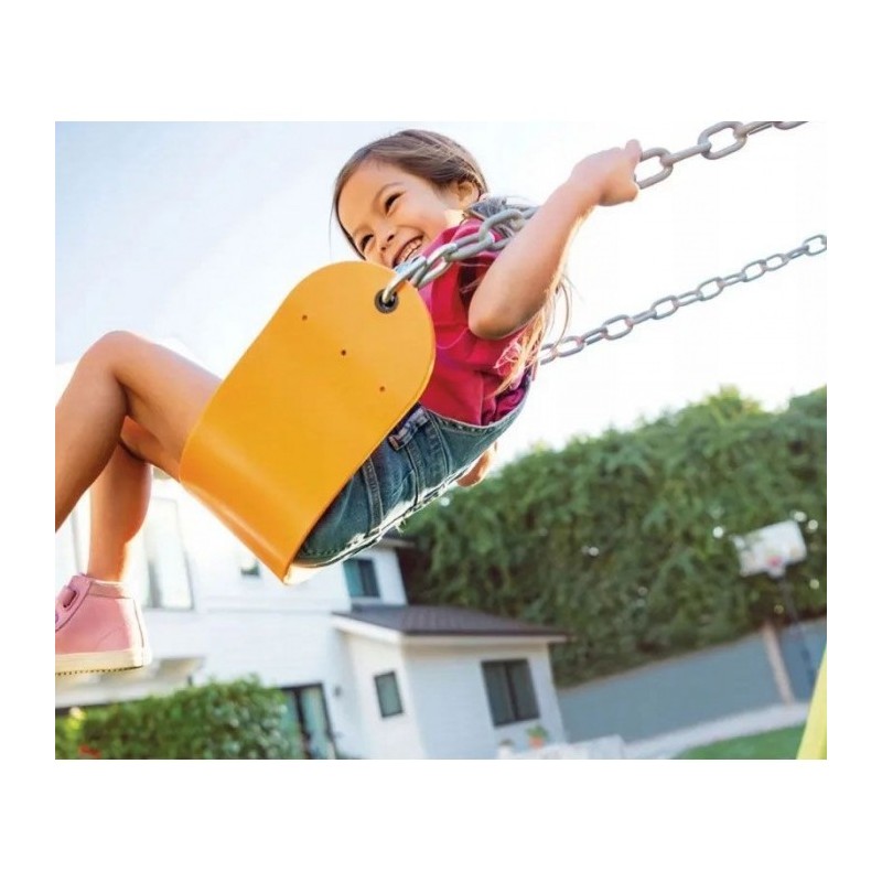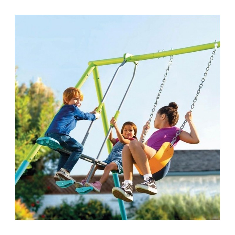 Setul de joaca pentru copii include un leagan clasic cu inaltime reglabila si scaun flexibil, precum si un leagan dublu cu suporturi pentru picioare si manere ergonomice.