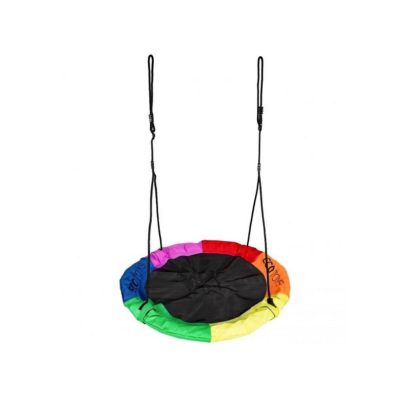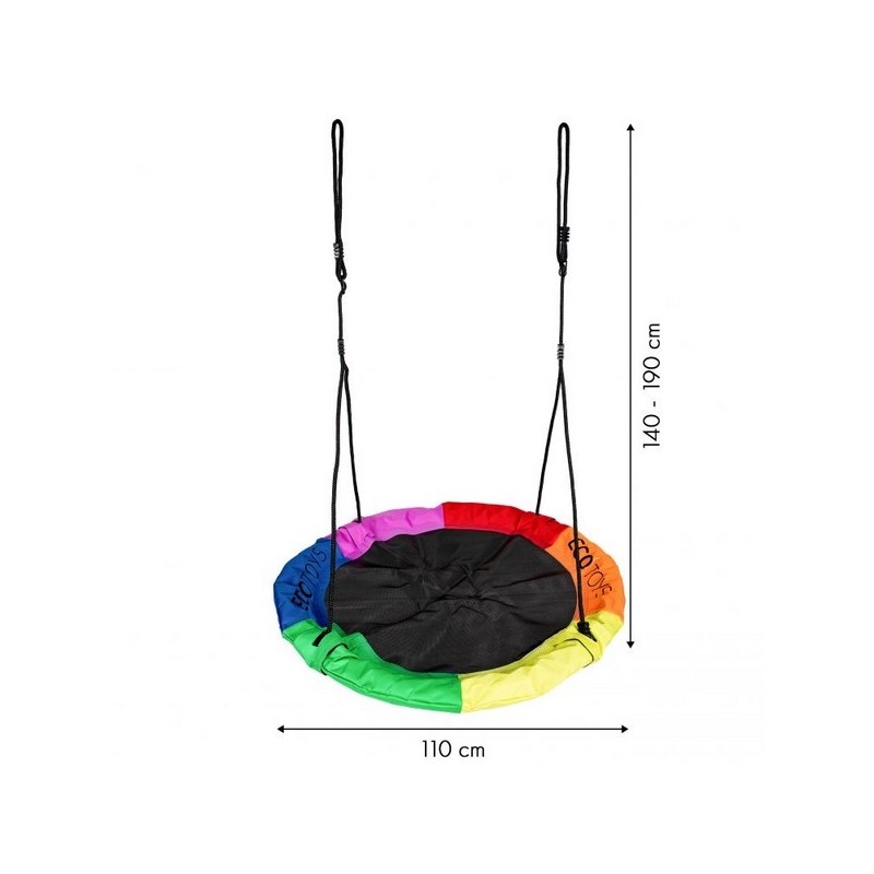 Scaunul cu diametrul de 110 cm este foarte confortabil, fiind fabricat din poliester durabil. Leaganul este sustinut de o franghie groasa de 10mm, care permite ajutarea inaltimii de la 140cm la 190cm.