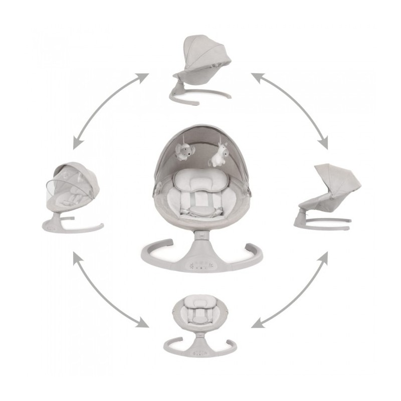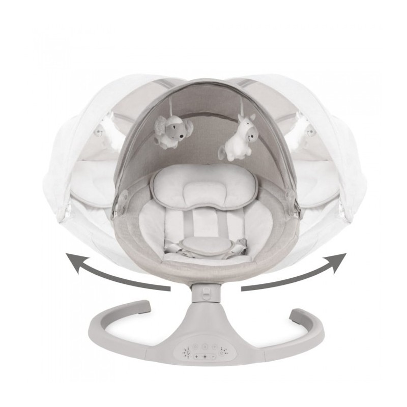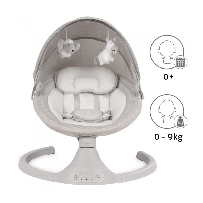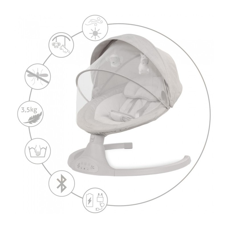 Leaganul electric este destinat copiilor din primele zile de viata. Produs 2 in 1 - leagan si balansoar. Un baldachin detasabil va proteja copilul de stimulii nedoriti - curenti, soare, miscari excesive in jur, va fi perfect pentru utilizarea pe o terasa sau un balcon. O plasa de tantari fixata cu fermoar va proteja pielea delicata impotriva muscaturilor.