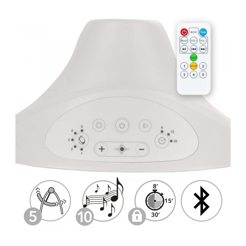 Functionarea silentioasa a motorului nu va impiedica copilul sa adoarma. Reglarea este in 5 trepte - a domeniului de oscilatie in lateral. Reglarea timpului de oscilare - 8, 15 sau 30 de minute. Contine si 10 melodii incorporate cu control al volumului.
