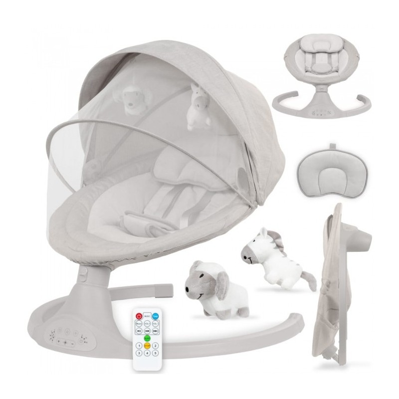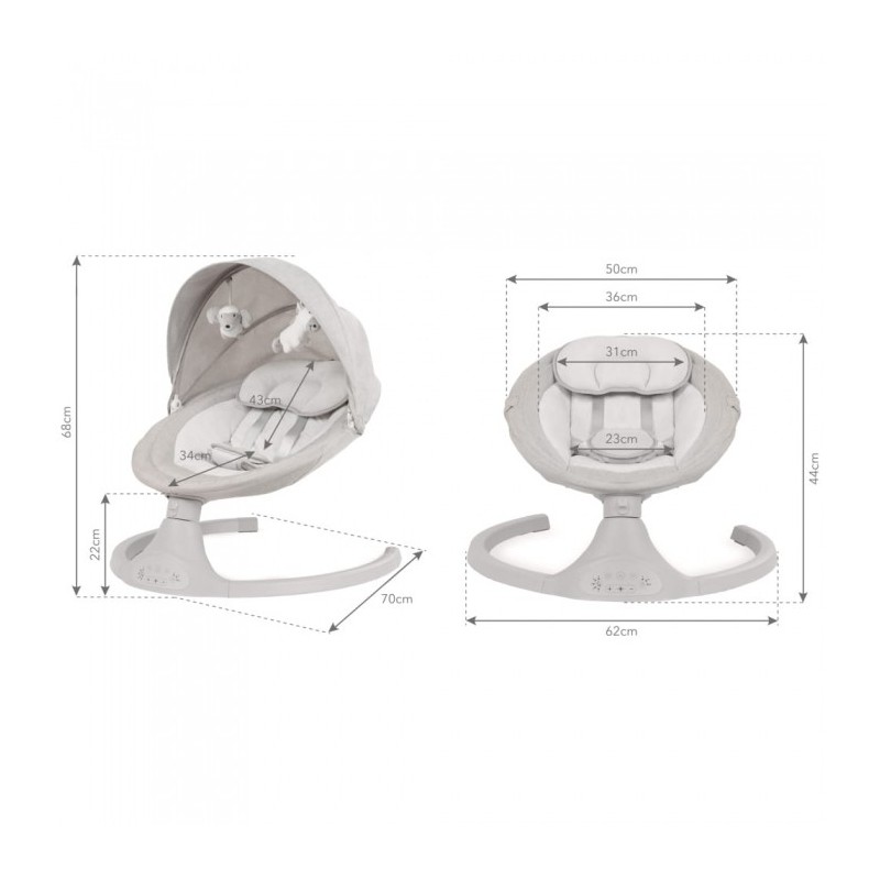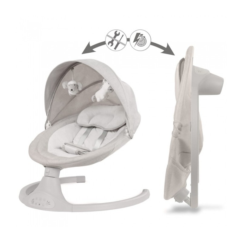 Telecomanda va va permite sa controlati leaganul si de la distanta. Asamblarea este rapida, fara utilizarea unor instrumente de montaj si exista posibilitatea de a plia balansoarul la o dimensiune compacta care va facilita depozitarea si transportul lui.