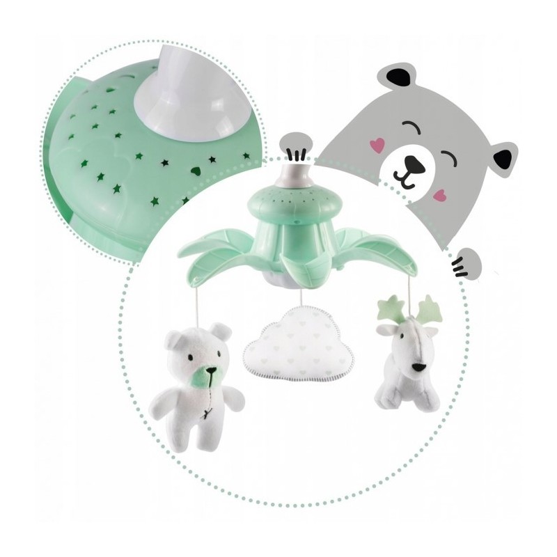 - Carusel de jucarie cu proiector: caruselul multifunctional va deveni cu siguranta subiectul unei mari distractii sau va ajuta copilul sa doarma. Caruselul din partea de sus are un proiector - stele dragute pot straluci cu o lumina placuta si delicata.