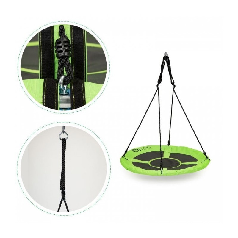 Leaganul este atasat cu franghii groase de 10 mm intr-un singur punct sau doua. Lungimea corzilor este reglabila, astfel incat sa ii puteti regla cu usurinta inaltimea. Sarcina maxima este de 100 kg. Materialul folosit pentru realizarea leaganului asigura rezistenta sa la conditiile meteorologice.