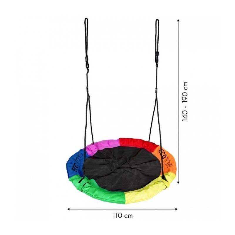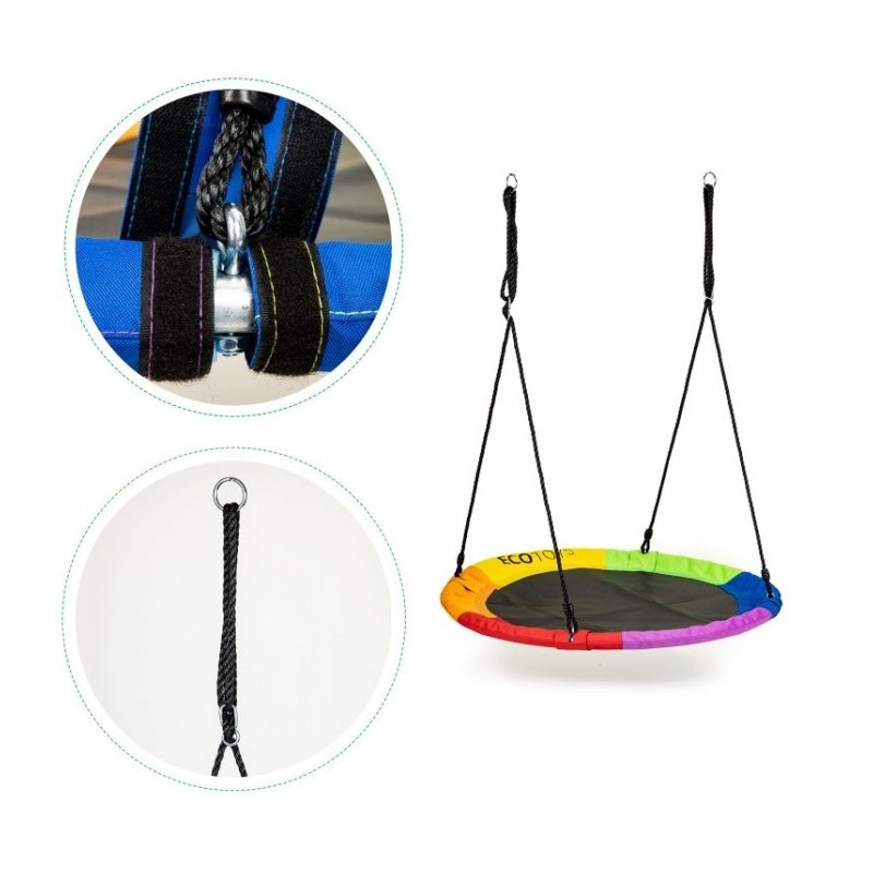 Leaganul este atasat cu franghii groase de 10 mm intr-un singur punct sau doua. Lungimea corzilor este reglabila, astfel incat sa ii puteti regla cu usurinta inaltimea. Sarcina maxima este de 150 kg. Materialul folosit pentru realizarea leaganului asigura rezistenta sa la conditiile meteorologice.