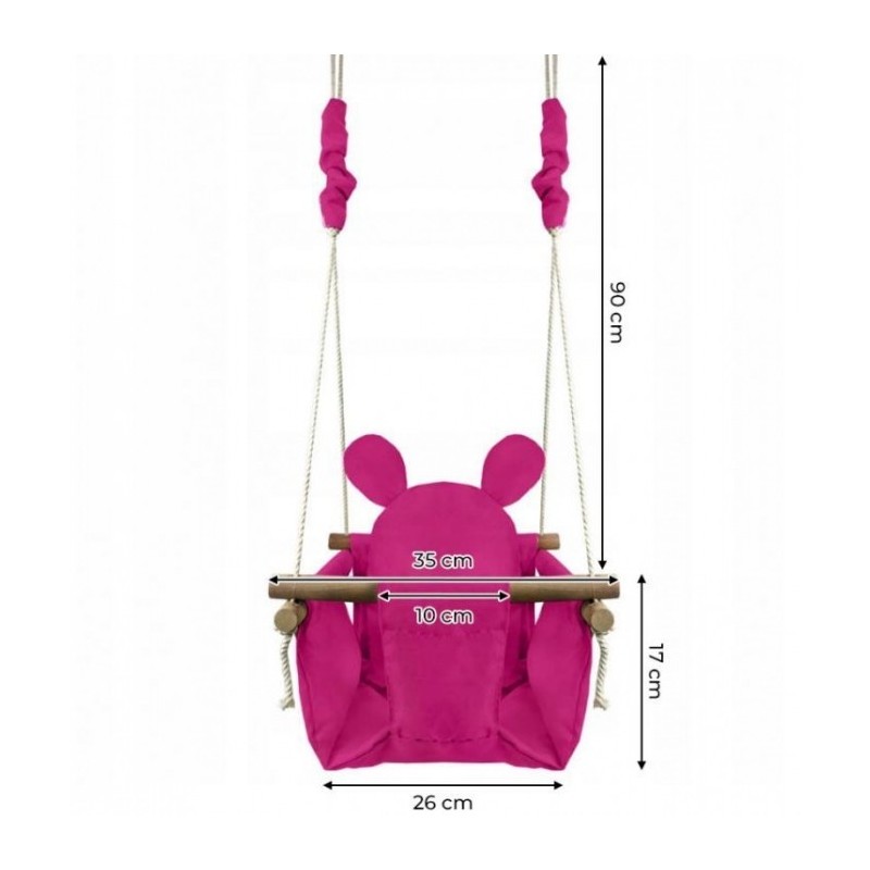 Cadrul leaganului este realizat din lemn slefuit cu grija, facandu-l complet sigur pentru copilul dvs. Leaganul vine cu trei perne moi, din material usor de curatat. Inaltimea leaganului poate fi reglata, lungimea franghiilor este de 90 cm.