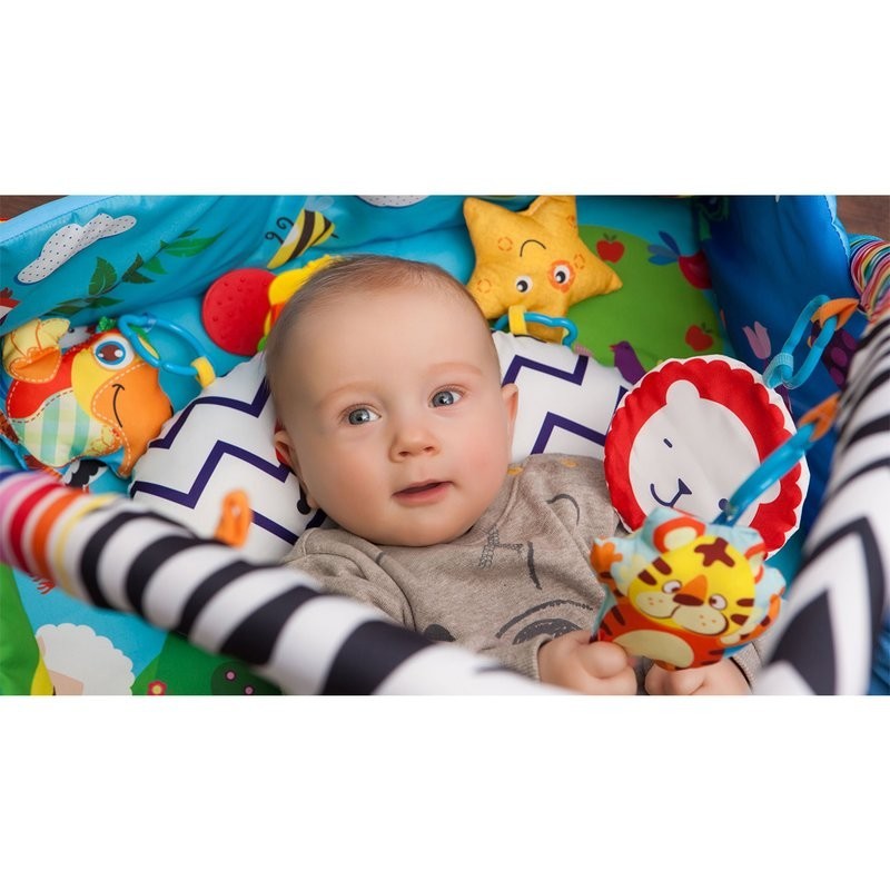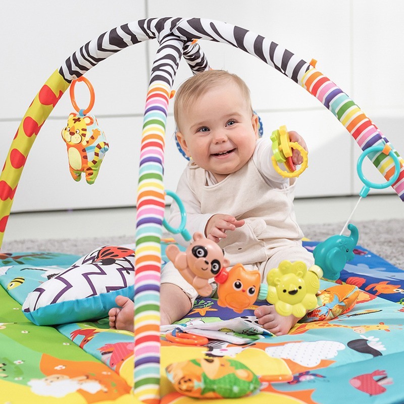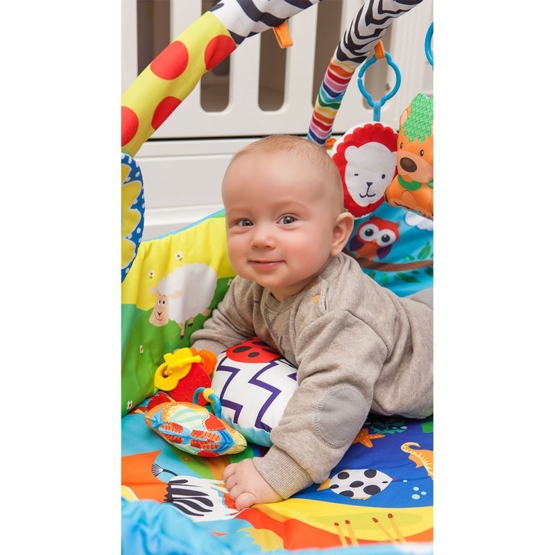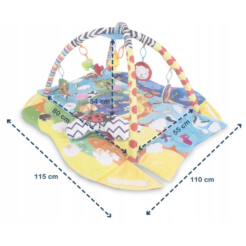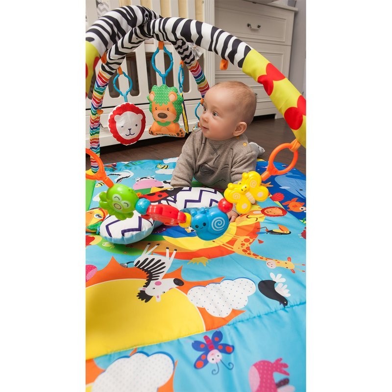 - Covorul educativ are un set de 4 jucarii suspendate pe un sir elastic, care sustin dezvoltarea corespunzatoare a copilului.