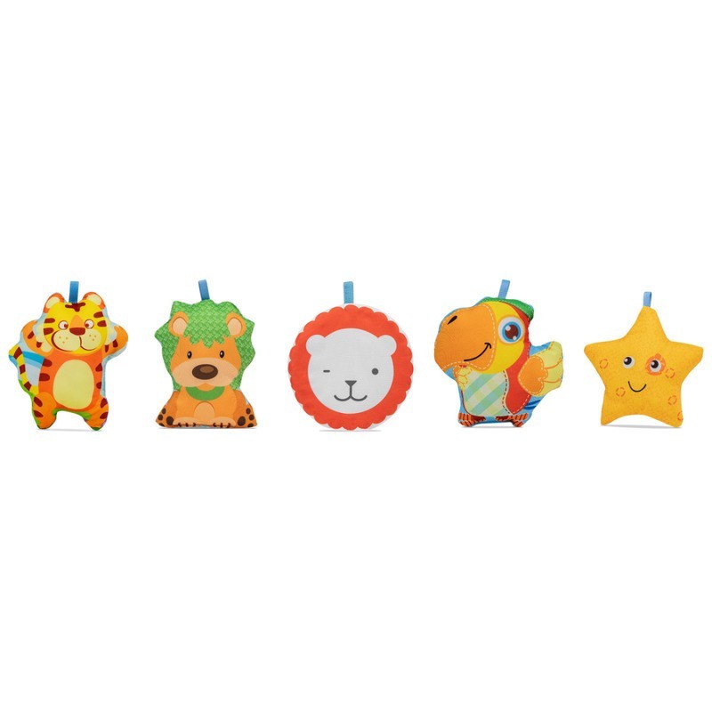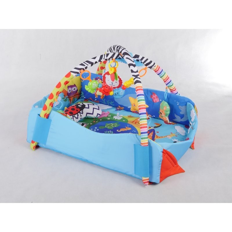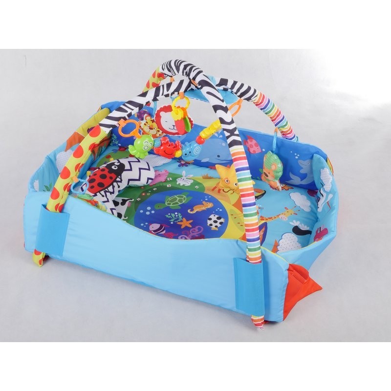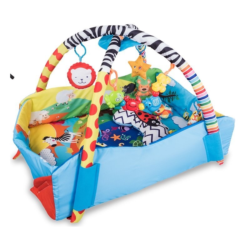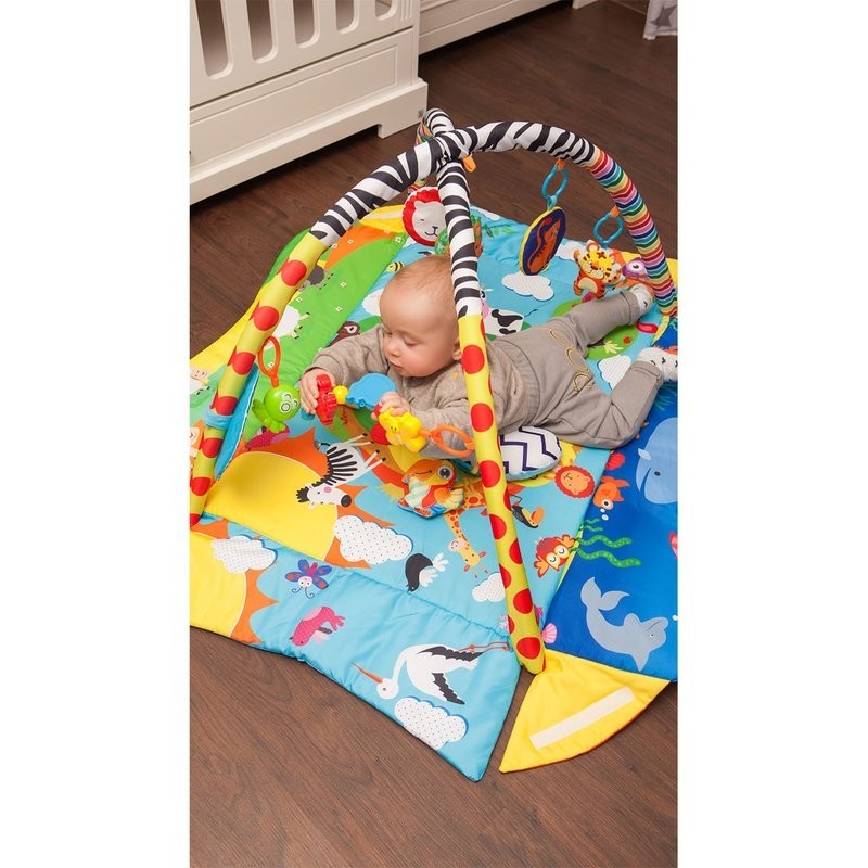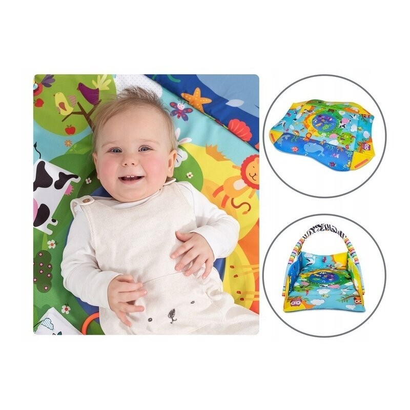 - Covorul educativ are un set de 4 jucarii suspendate pe un sir elastic, care sustin dezvoltarea corespunzatoare a copilului.