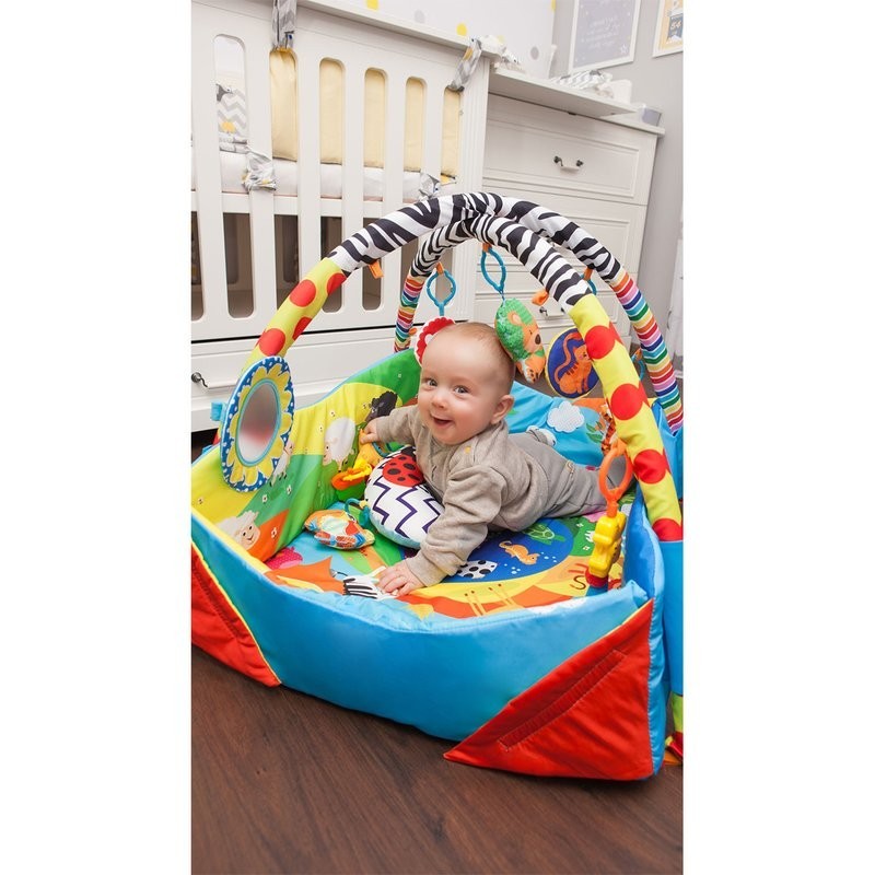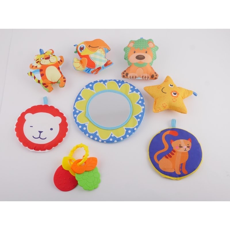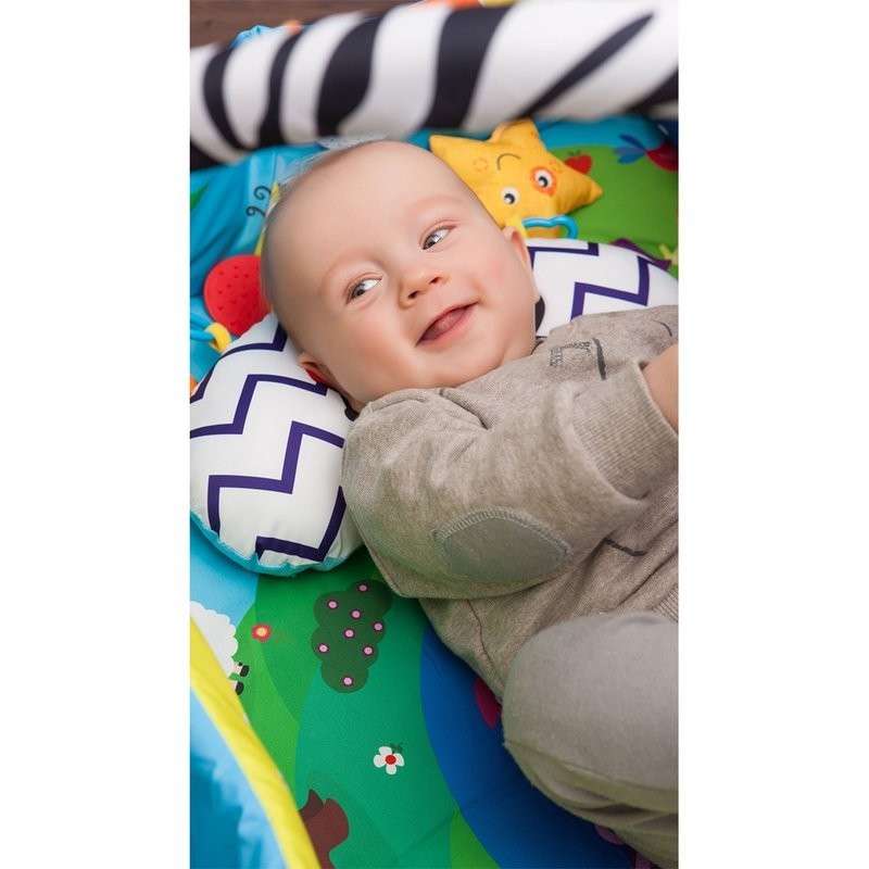 - Produsul are un set bogat de accesorii sub forma unei perne Tummy Time, un set de 4 jucarii individuale de marime generoasa, o bara cu 4 jucarii din plastic, o jucarie de dentitie si oglinda.