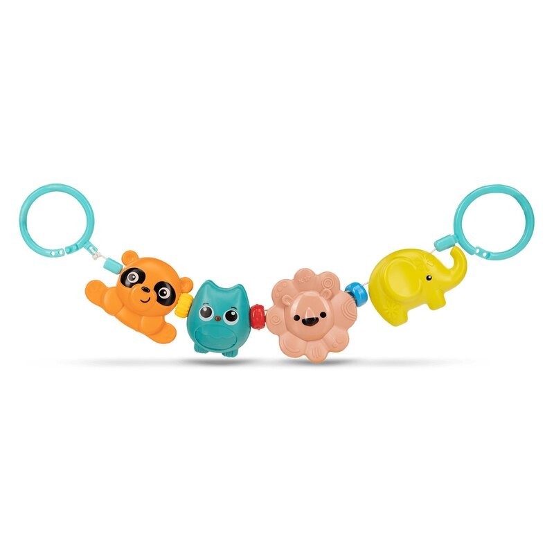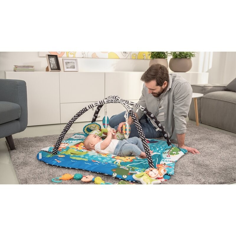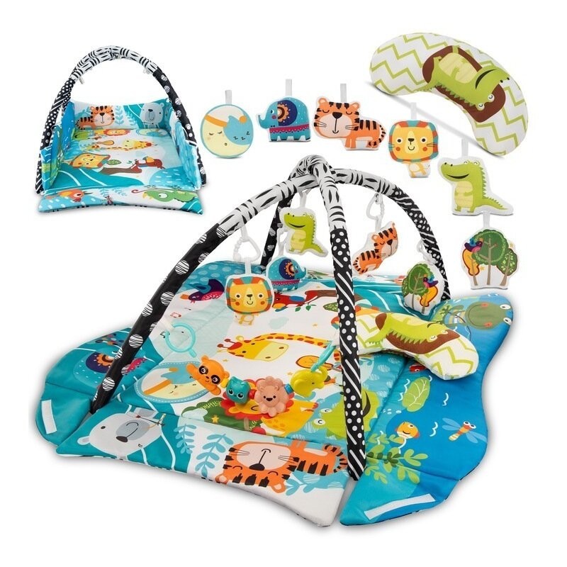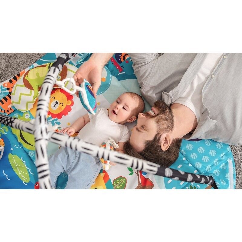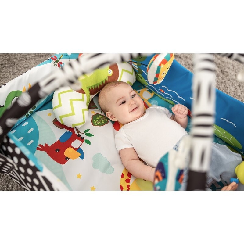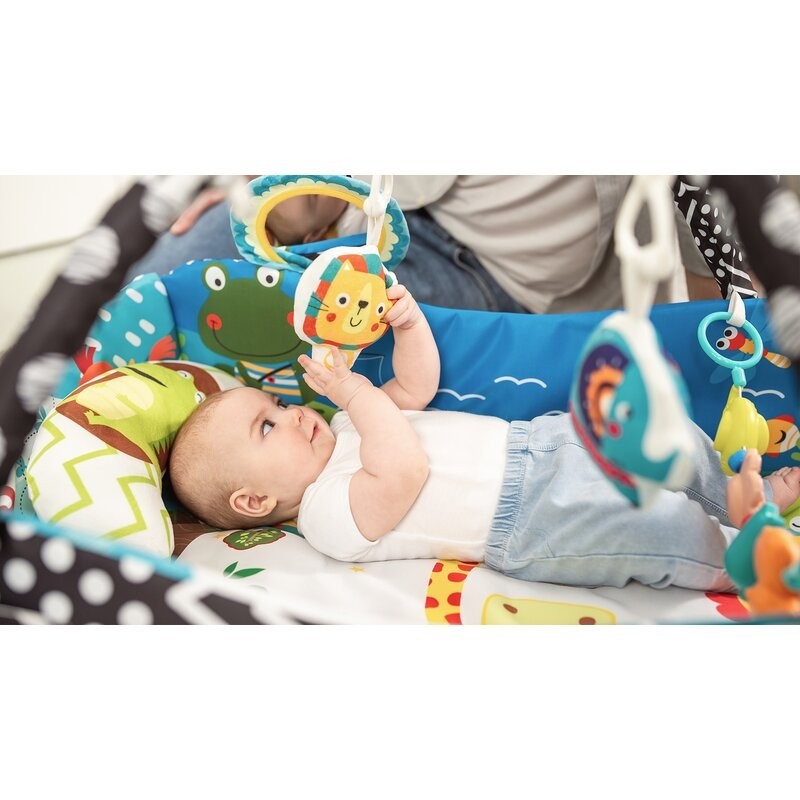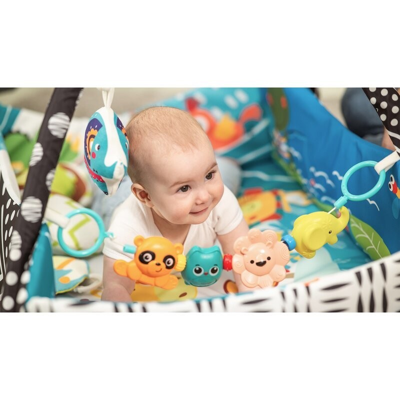 - Covorul educativ are un set de 4 jucarii suspendate pe un sir elastic, care sustin dezvoltarea corespunzatoare a copilului.