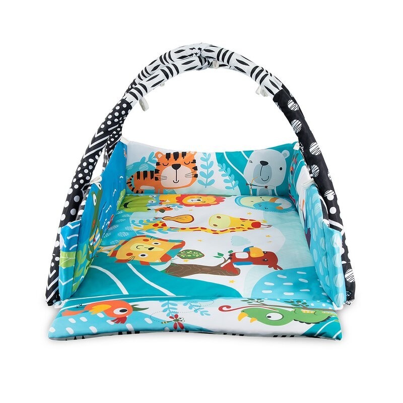 - Produsul are un set bogat de accesorii sub forma unei perne Tummy Time, un set de 4 jucarii individuale de marime generoasa, o bara cu 4 jucarii din plastic, o jucarie de dentitie si oglinda.