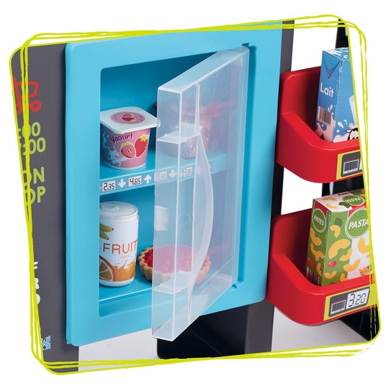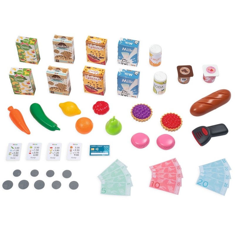 - Setul include: magazin mare cu mai multe locuri de joaca: casa de marcat, mini-standuri, frigider, colt de fructe / legume, cantar, casa de marcat electronica cu display LCD integrat, sertar pentru bani, scaner cu sunete si lumini, ceas si panou de informatii (deschis / inchis), cantar, frigider, microfon (decorativ, fara functii), terminal card de credit cu chitante, cos de cumparaturi, monede si bancnote, card de credit, 4 chitante, paine, legume si fructe, produselor alimentare