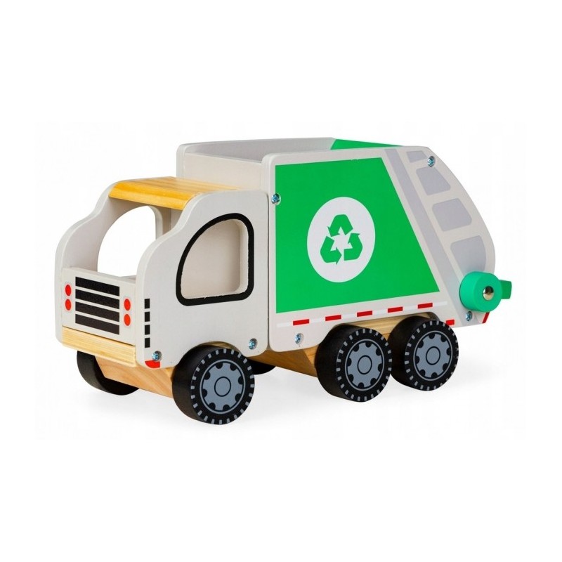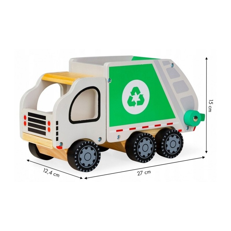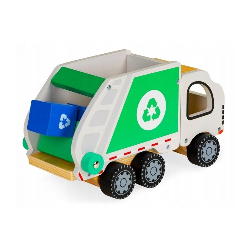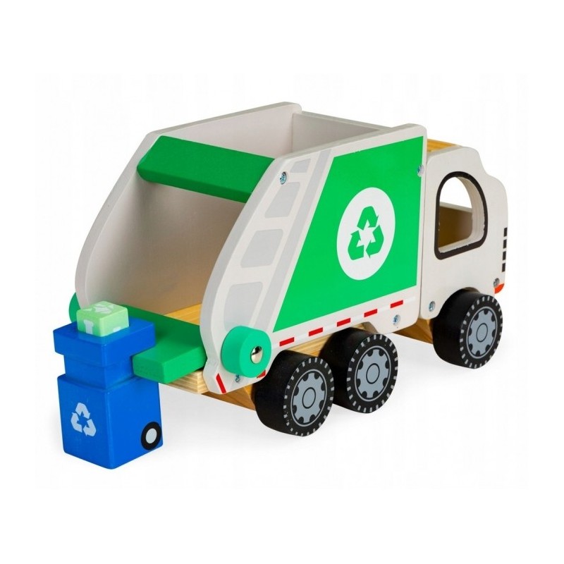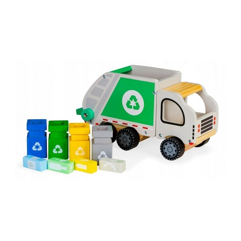 Jucaria este realizata in intregime din lemn. Ideea perfecta pentru a completa colectia de vehicule de acasa. Include un camion de gunoi si cosuri de gunoi colorate. Jucaria este recomandata copiilor de peste 3 ani. Dezvolta imaginatia si ofera ore lungi de distractie.