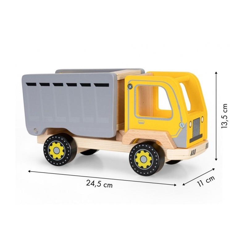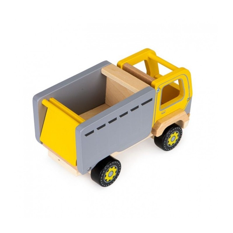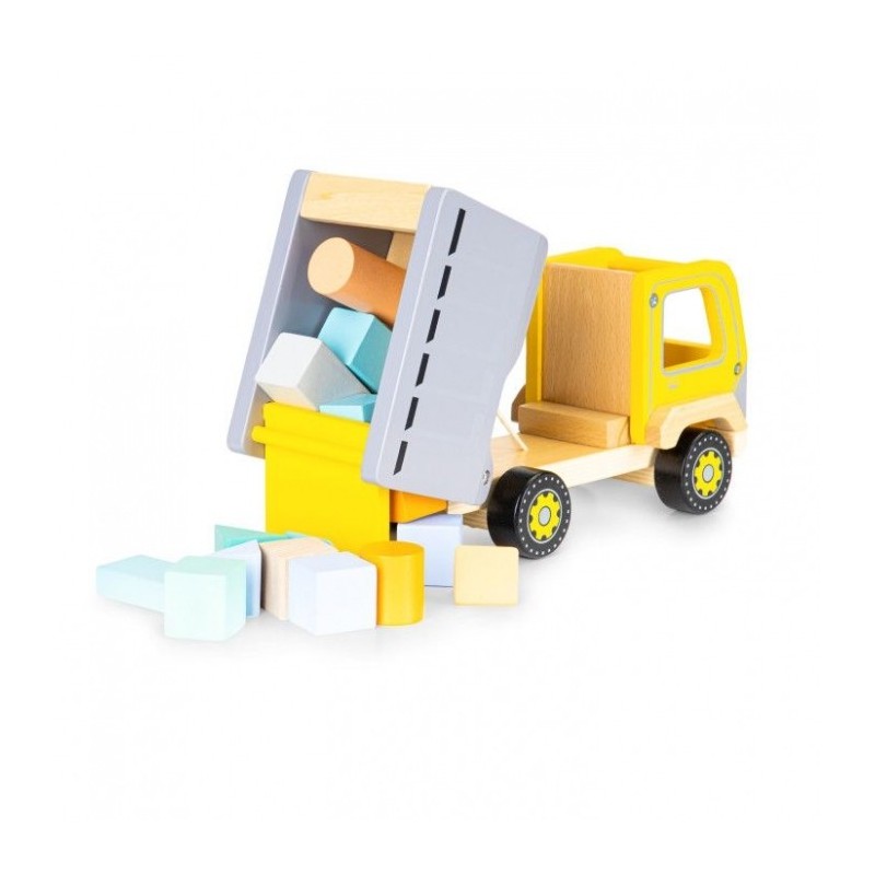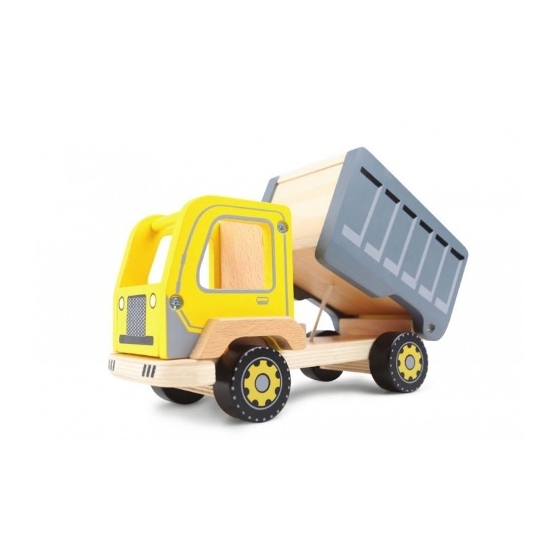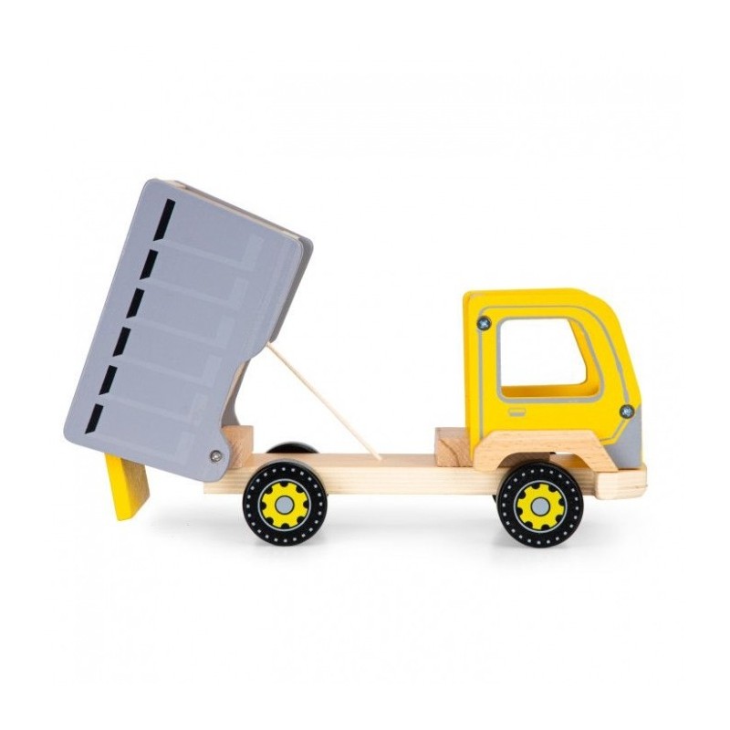 Masinuta din lemn poate transporta blocuri din lemn sau alte obiecte mai mici. Are un container mobil, basculant. Jucaria este recomandata copiilor de peste 3 ani.