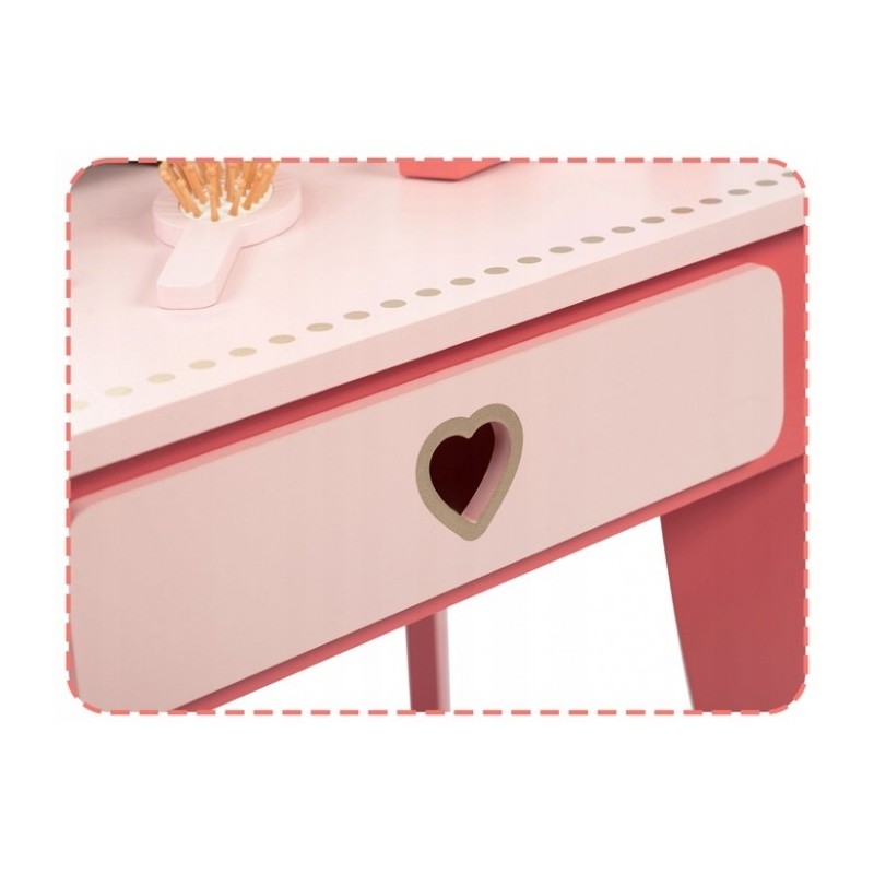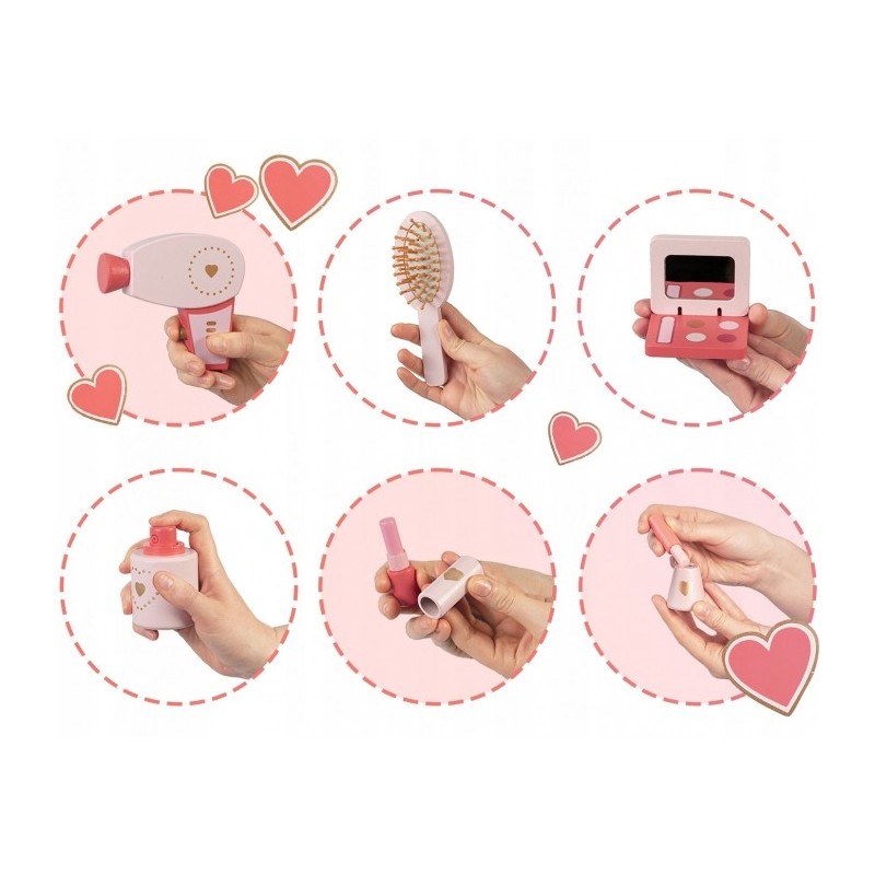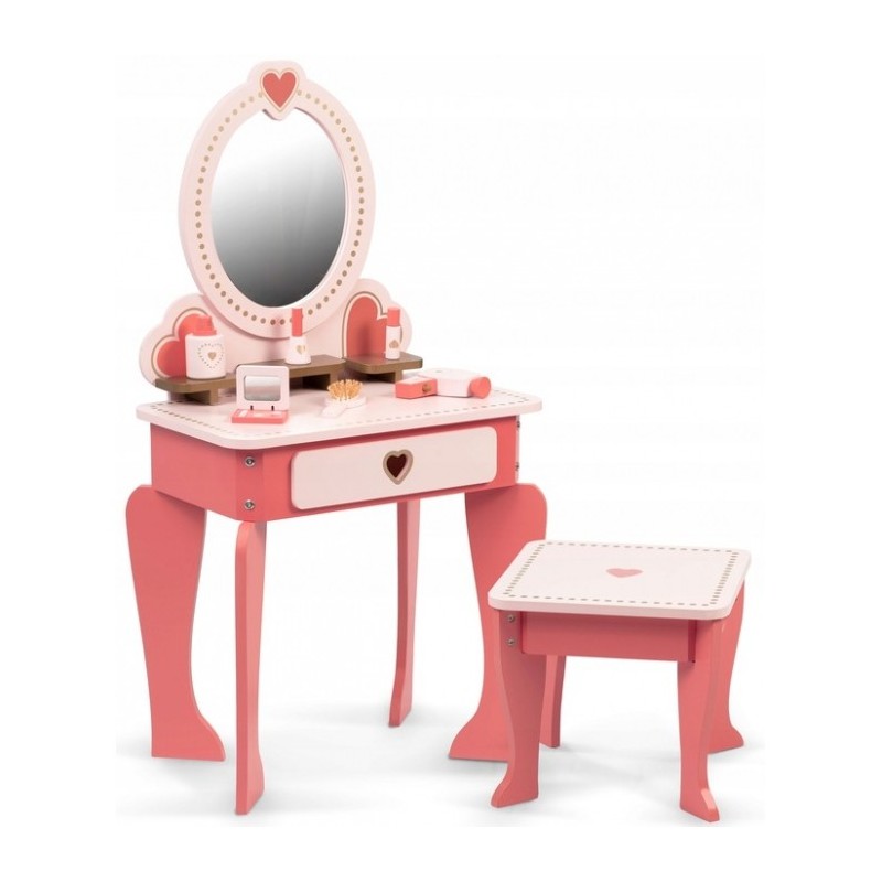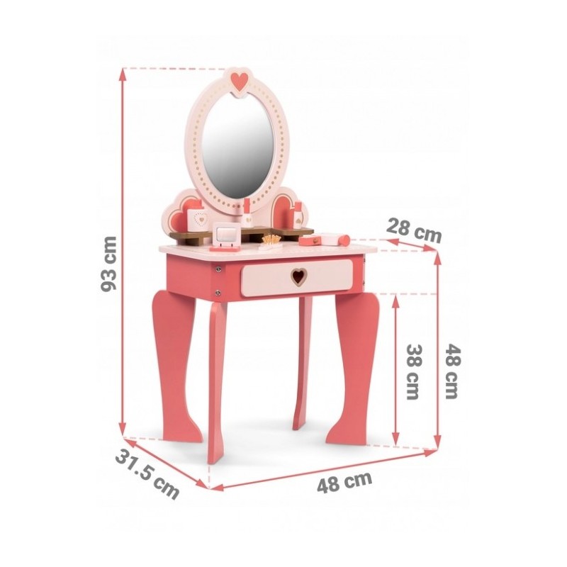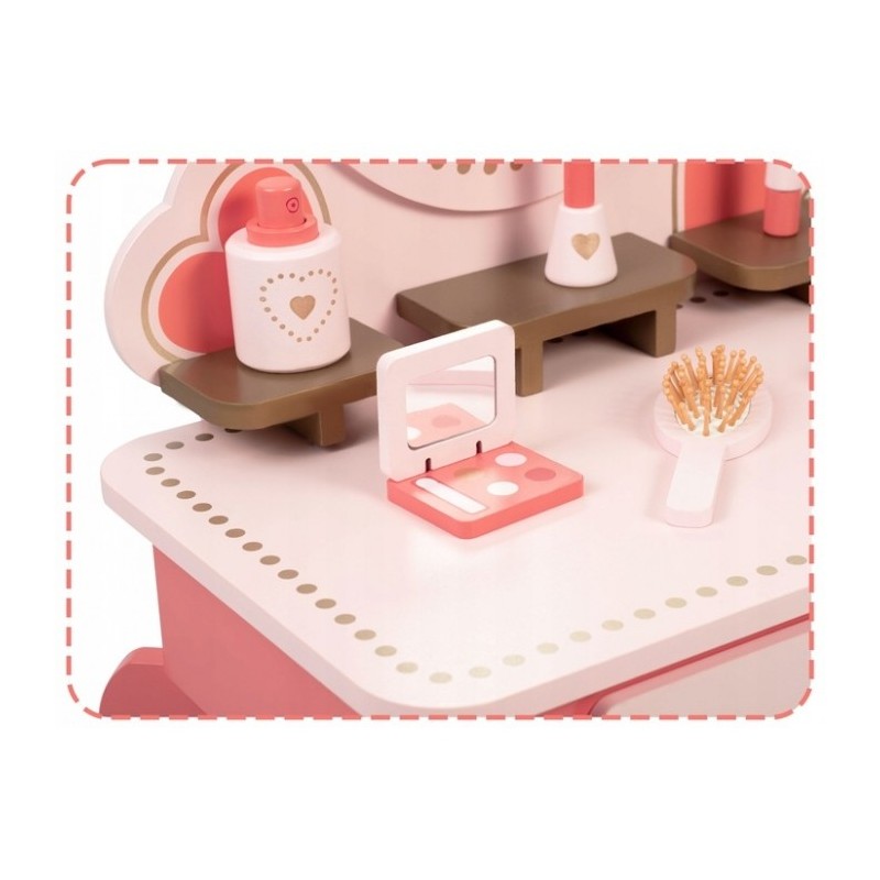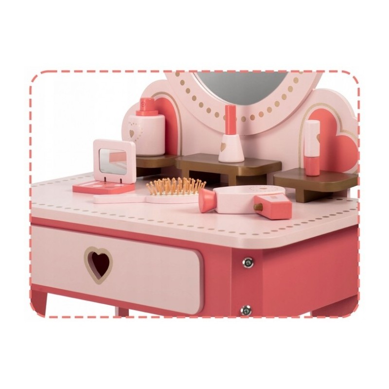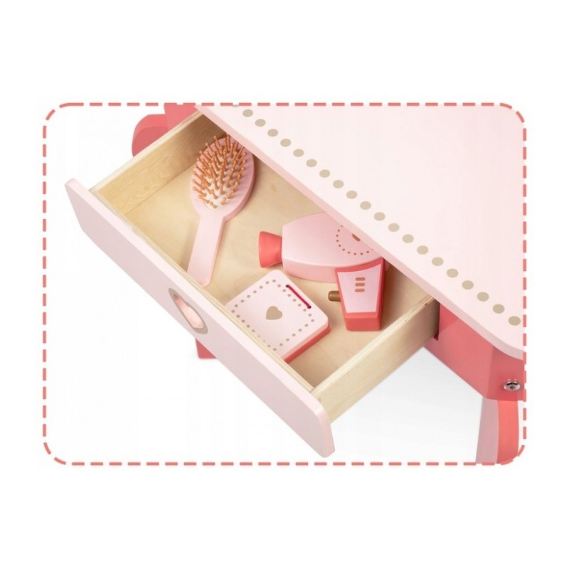 Setul include mobilierul si articole de toaleta puternice si stabile, rafinate - precum o perie de par, uscator, parfum, trusa de machiaj - care pot fi ascunse intr-un sertar dupa utilizare. Accesorii frumoase din lemn incluse - manopera de inalta calitate.