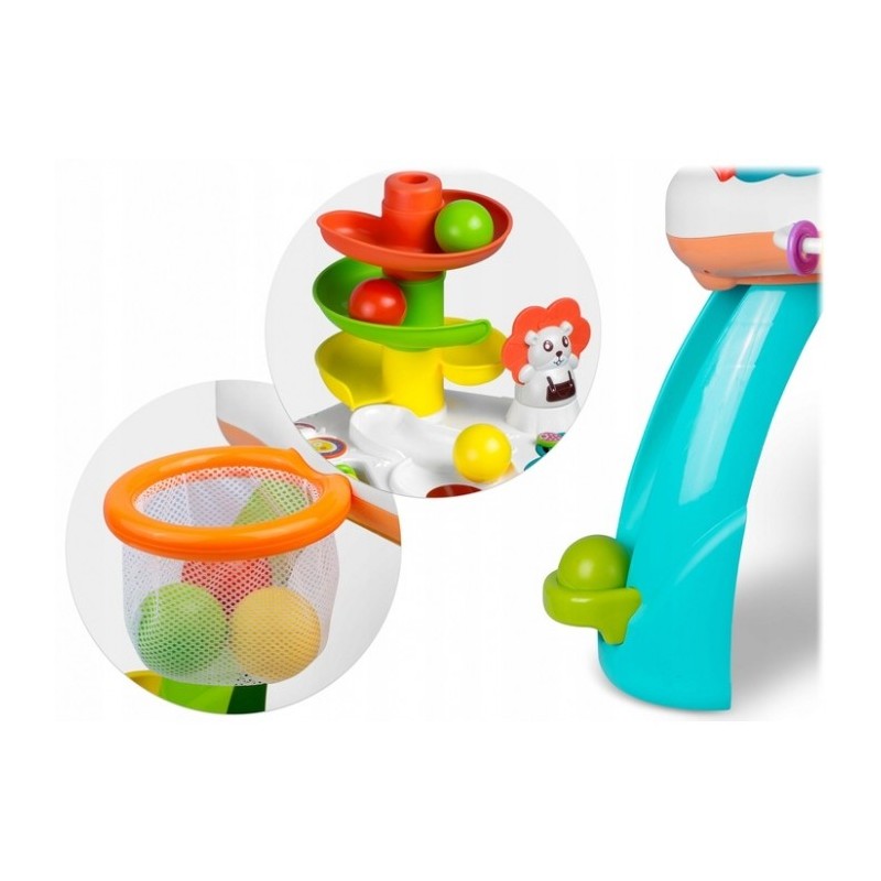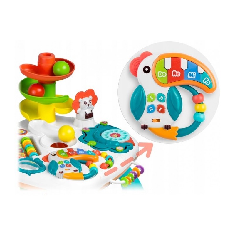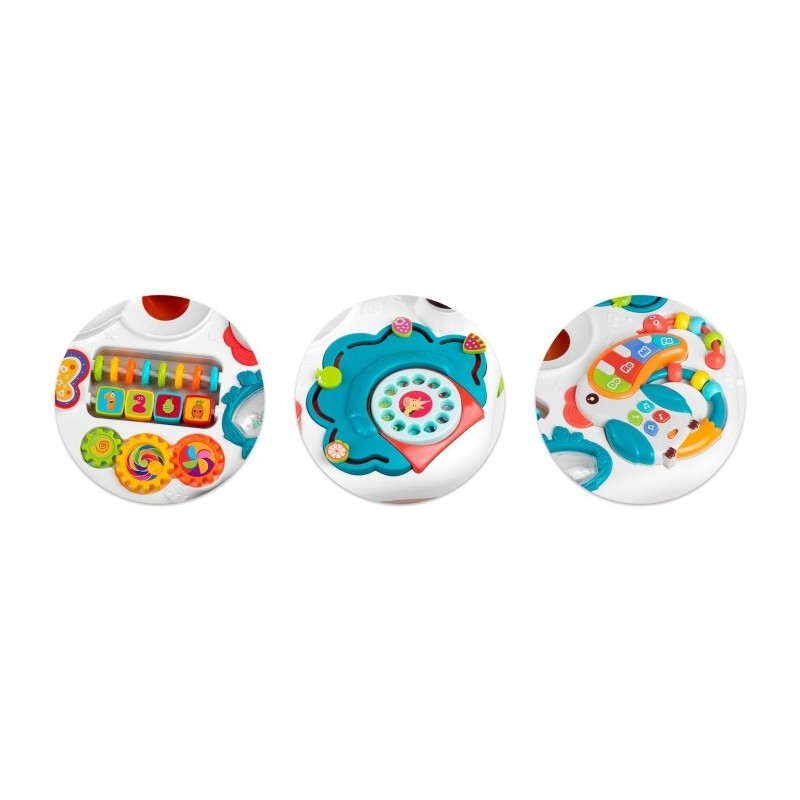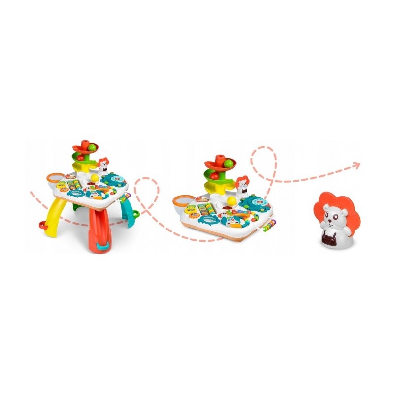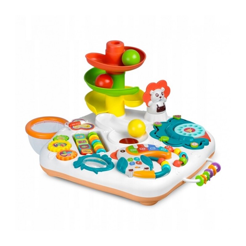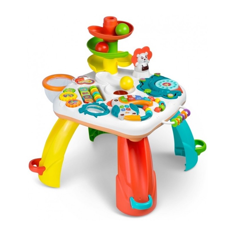 Masuta este ideala pentru invatarea numerelor, culorilor si formelor. Panoul detasabil poate fi folosit ca tabla educationala, iar dupa adaugarea picioarelor, se transforma intr-o masa educationala.