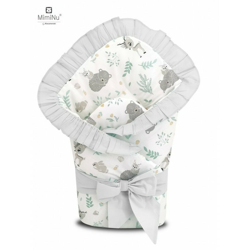 MimiNu - Paturica de infasat multifunctionala Cu volanase Cu inchidere cu panglica si arici velcro Dimensiune 75x75 cm Din bumba