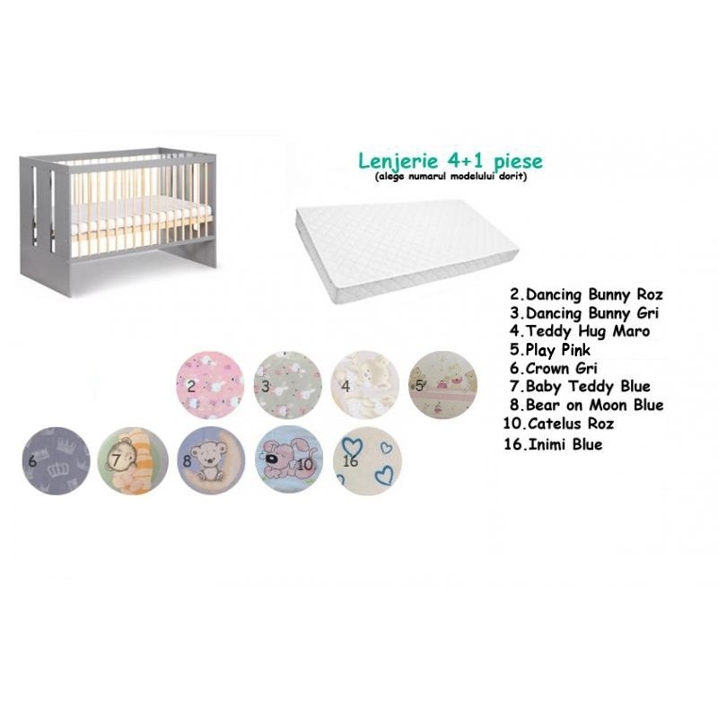Pachet 3 in 1 Pauline Graphite Natur + Saltea MyKids Confort 120x60x10 + Lenjerie 4+1 piese