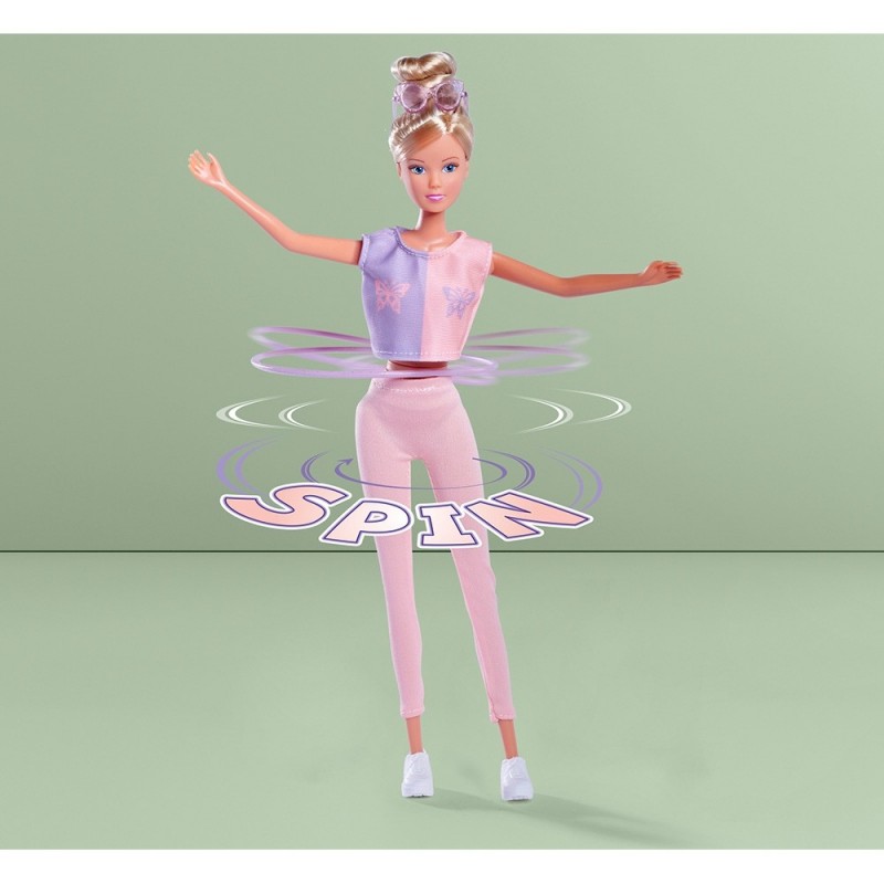 Steffi Love are 29 cm inaltime si poarta o tinuta sport formata din colanti roz, un crop top cu imprimeu de fluturasi, pantofi sport si ochelari ce ii completeaza perfect tinuta