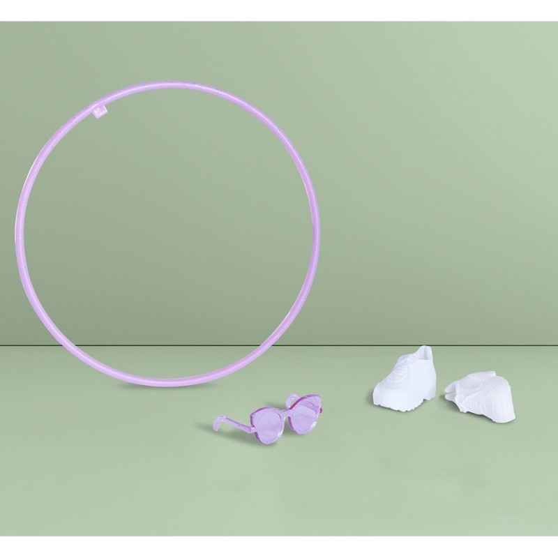 Cercul hula hoop se poate atasa usor de solduri, trebuie doar ridicate mainile papusii si fixat cercul