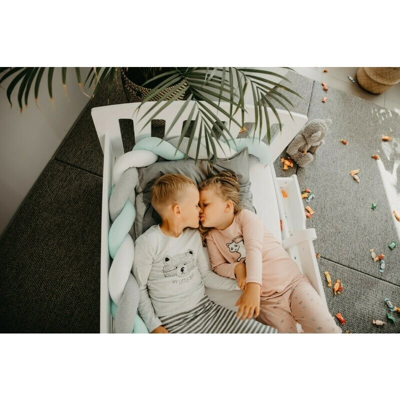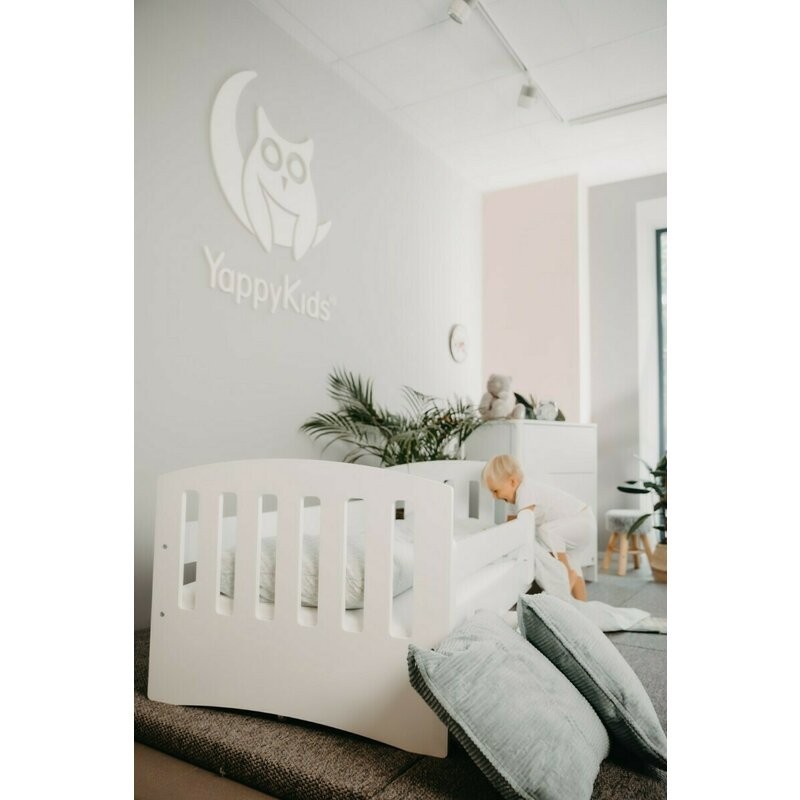 - Pentru siguranta copilului dumneavoastra, este posibil sa atasati partea laterala a protectiei (inclusa) prin blocarea acesteia pe o parte sau cealalta a patului YappyLux.