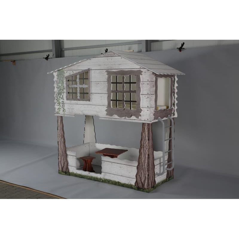 Patul dispune de o saltea, iar suprafata de jos este o zona de joaca. Setul include doua scaune si o masa.