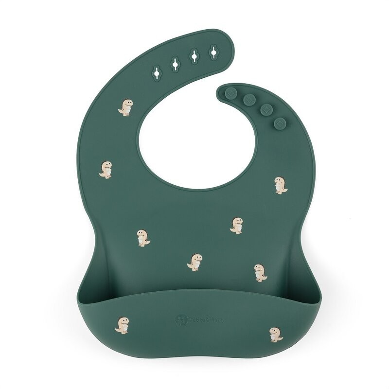 Petite&Mars - Baveta moale Take&Match Reglabil Cu buzunar colector Silicon Fara BPA 6 luni+ Model dinozauri Verde