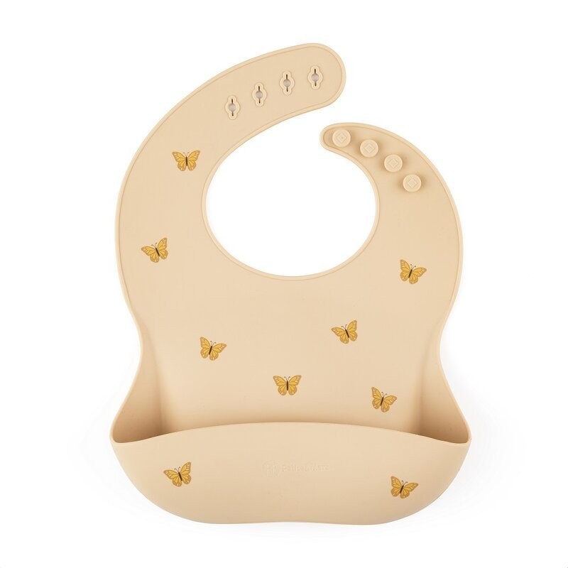 Petite&Mars - Baveta moale Take&Match Reglabil Cu buzunar colector Silicon Fara BPA 6 luni+ Model fluturasi Bej